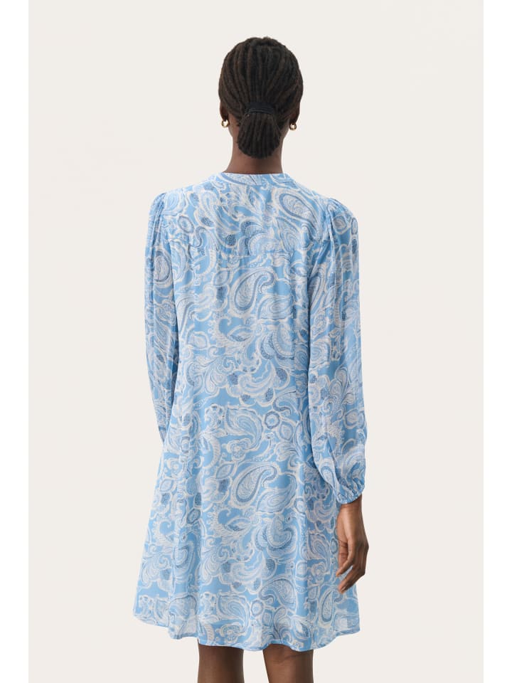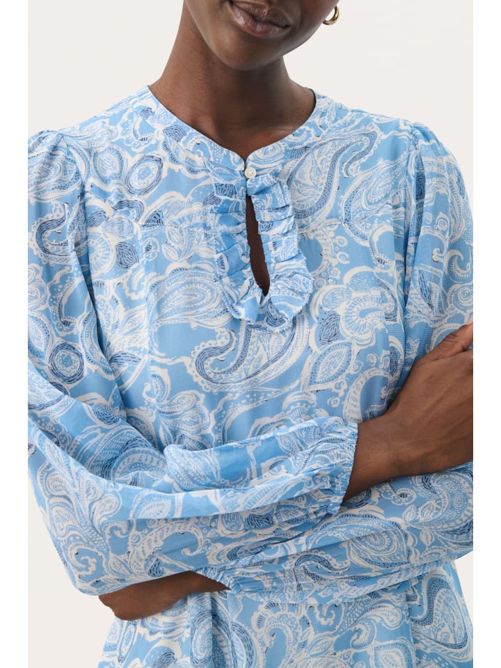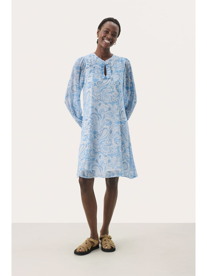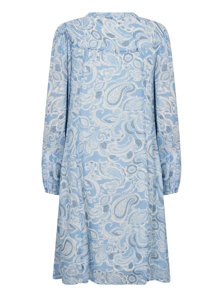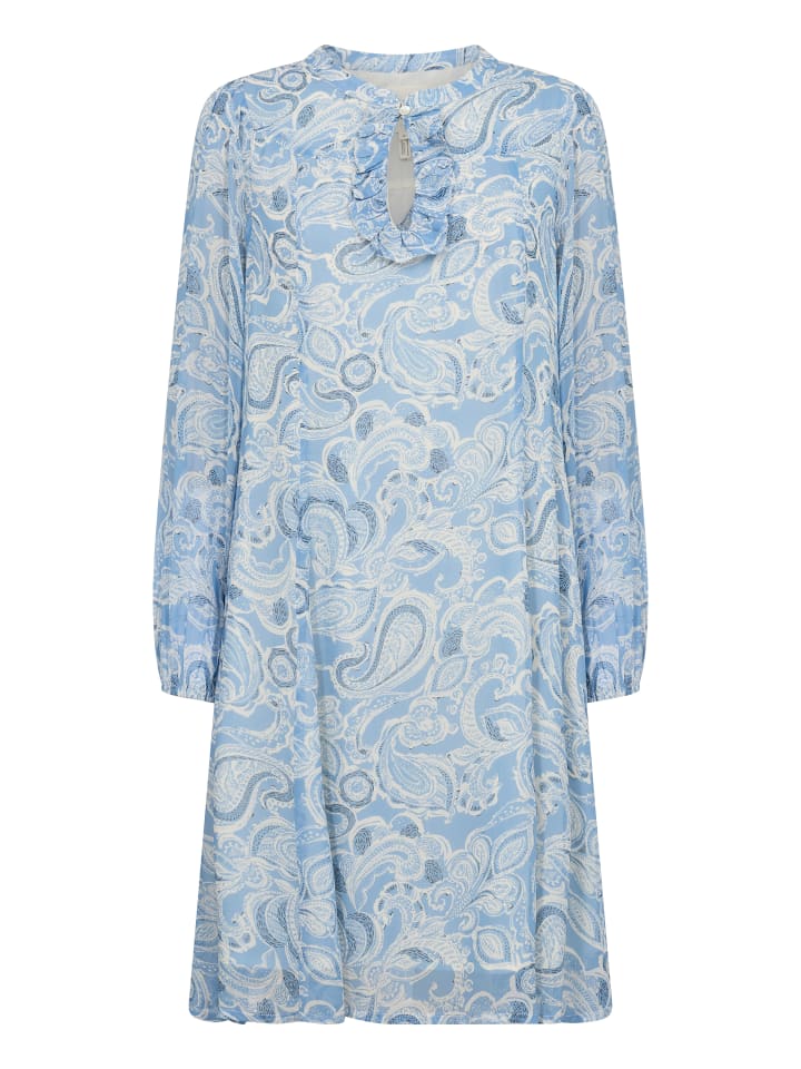 Платье А-силуэта с нежным узором в виде завитков, вырезом-замочной скважиной с оборкой и длинными, слегка присборенными рукавами - непринужденная элегантность.