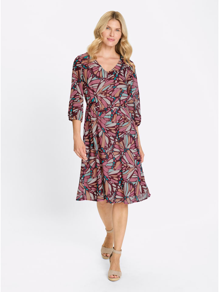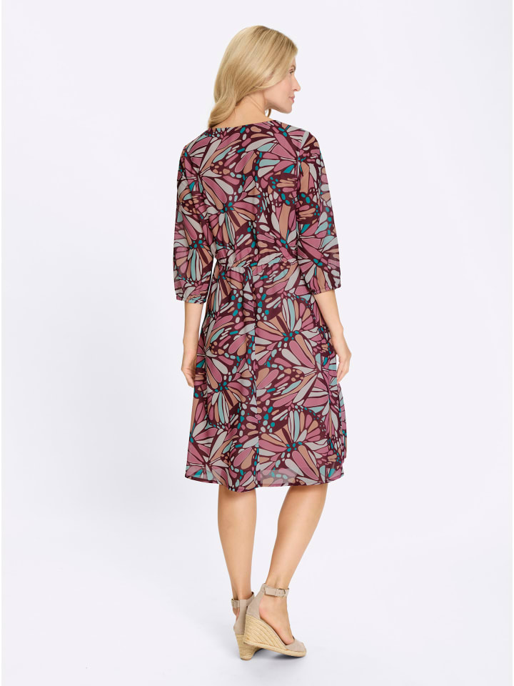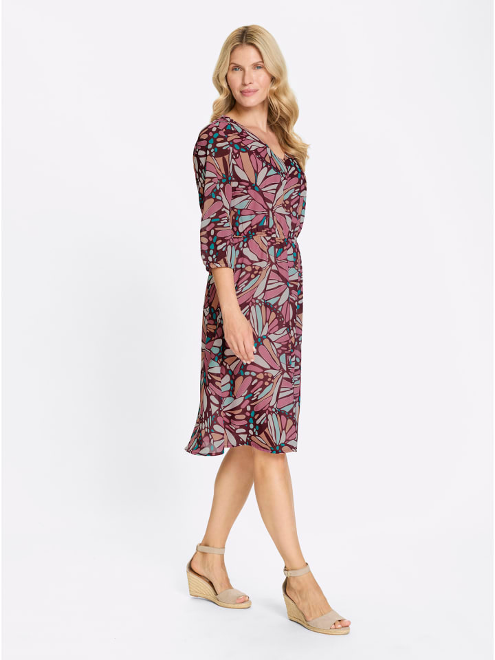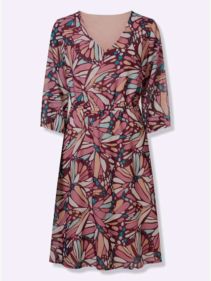 Это платье - настоящая приманка для глаз! Оно украшено потрясающим узором, вдохновленным крыльями бабочки. Визуально удлиненный V-образный вырез, рукава длиной 3/4 с эластичными манжетами и эластичная талия создают изящный силуэт. Вытачки на груди. Платье изготовлено из легкого и воздушного жоржета и полностью на подкладке спереди и сзади. Изготовлено из переработанного полиэстера.