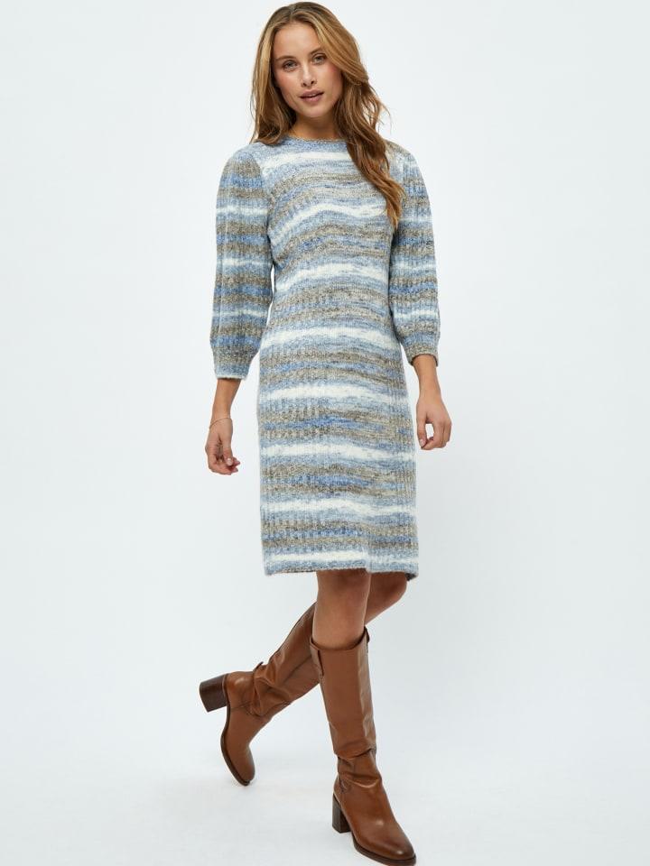 Мягкое трикотажное платье с объемными рукавами и круглым вырезом. Длина рукавов 3/4, резинка на горловине, манжетах и подоле.