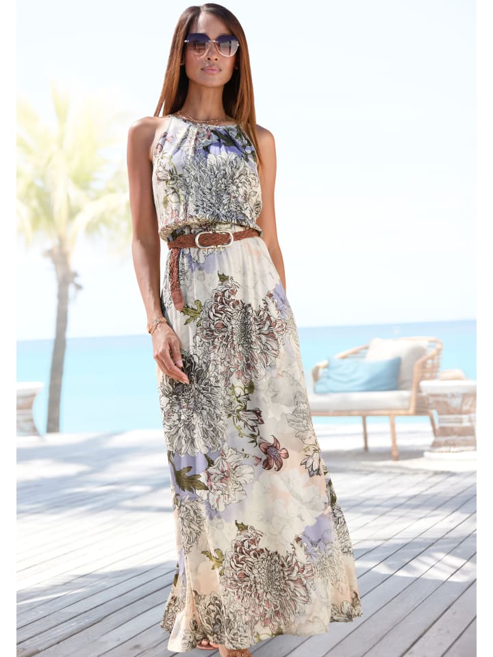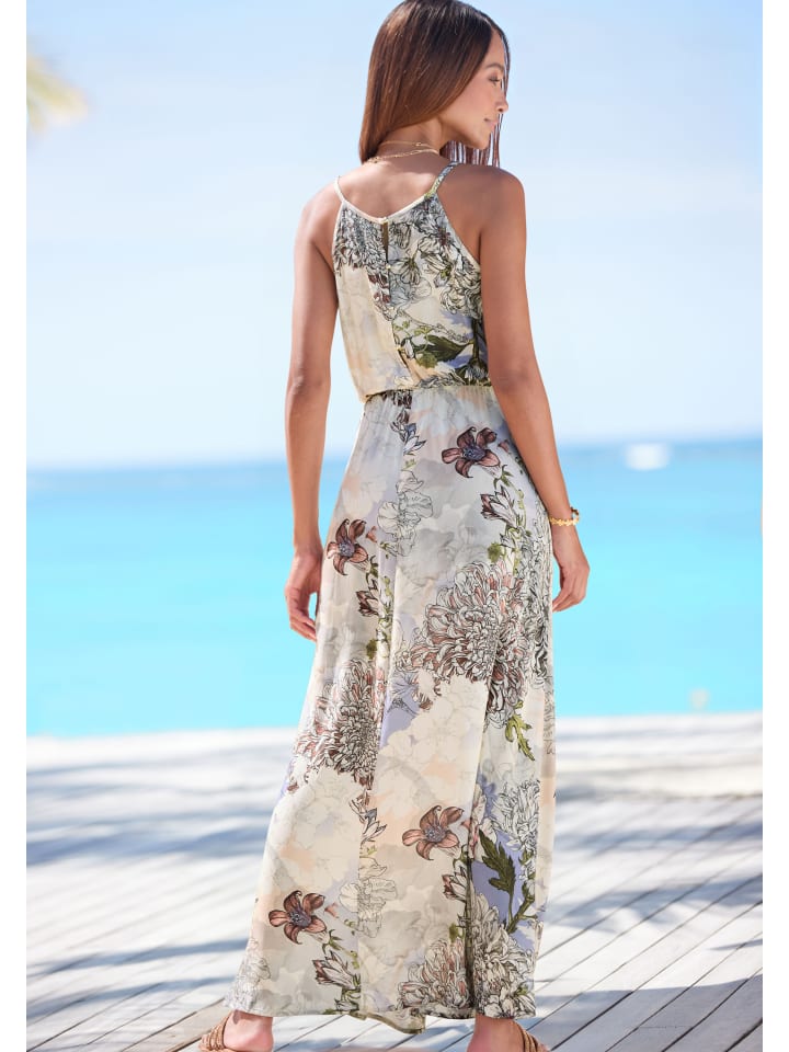 Воздушное макси-платье от Buffalo с принтом по всей поверхности и тонкими бретельками. Эластичная талия. Разрез с блестящими пуговицами сзади. Круглый вырез с едва заметной сборкой. Мягкая вискозная ткань.