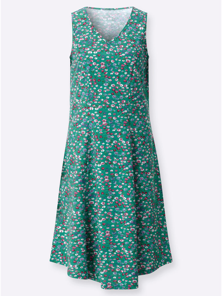 Прекрасное, как цветущий луг: приятное для кожи трикотажное платье в стиле «Миллефлерс». Свободный А-силуэт с моделирующими швами спереди и сзади. Платье имеет V-образный вырез с окантовкой и широкие бретели с окантовкой. Поддерживает инициативу «Хлопок, сделанный в Африке».