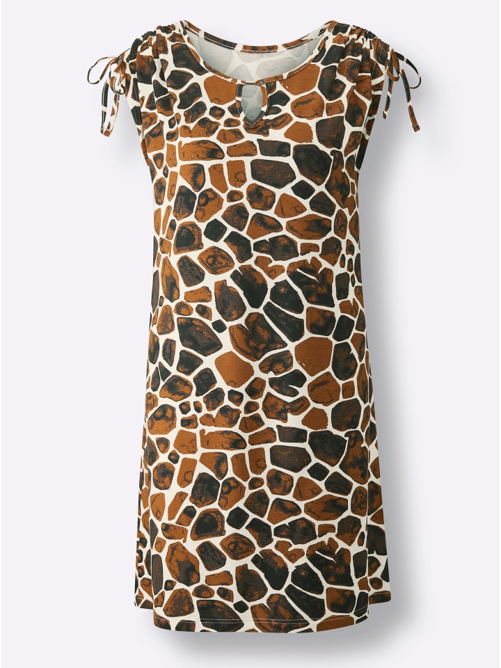 Это летнее платье с эффектным анималистичным принтом и выгодно подчеркивающим фигуру А-силуэтом. Круглый вырез горловины украшен небольшим разрезом и декоративной застежкой. Небрежно спущенные плечи дополнены поясом-завязкой. Изготовлено из вискозы ECOVERO от Lenzing. Одинарный трикотаж.