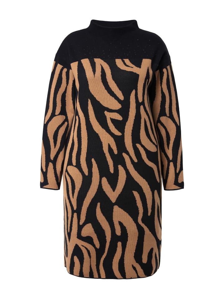 Трикотажное платье, короткое, свободного кроя, из мягкого жаккардового трикотажа с принтом «зебра». Бюст украшен черными стразами. Воротник-стойка и спущенная линия плеча, однотонный. Длинные рукава, гладкий низ.