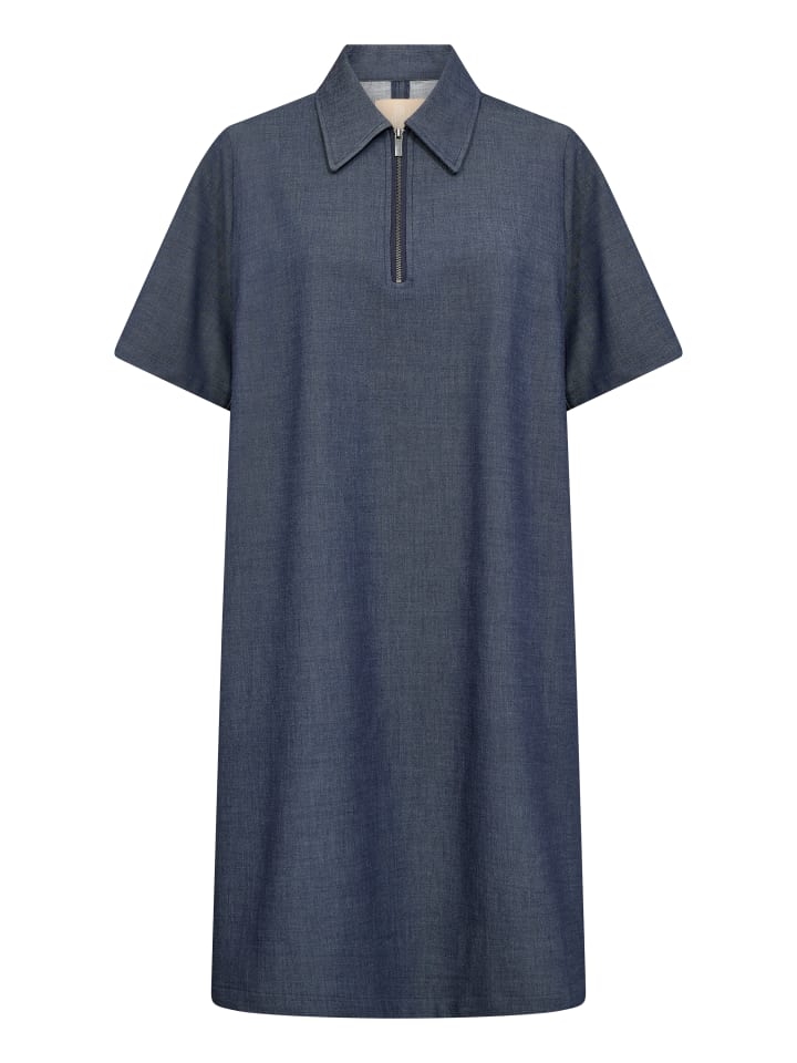 Это платье-поло на молнии впечатляет своим прямым силуэтом, короткими рукавами и выразительным воротником. Мягкая текстура создает простой и современный образ.