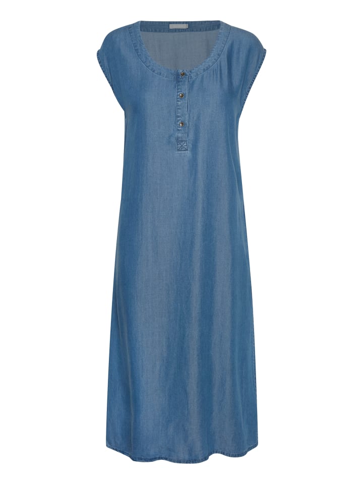 Платье из денима прямого кроя с круглым вырезом, втачными рукавами и планкой на трех пуговицах. Мягкая поверхность, длина миди.