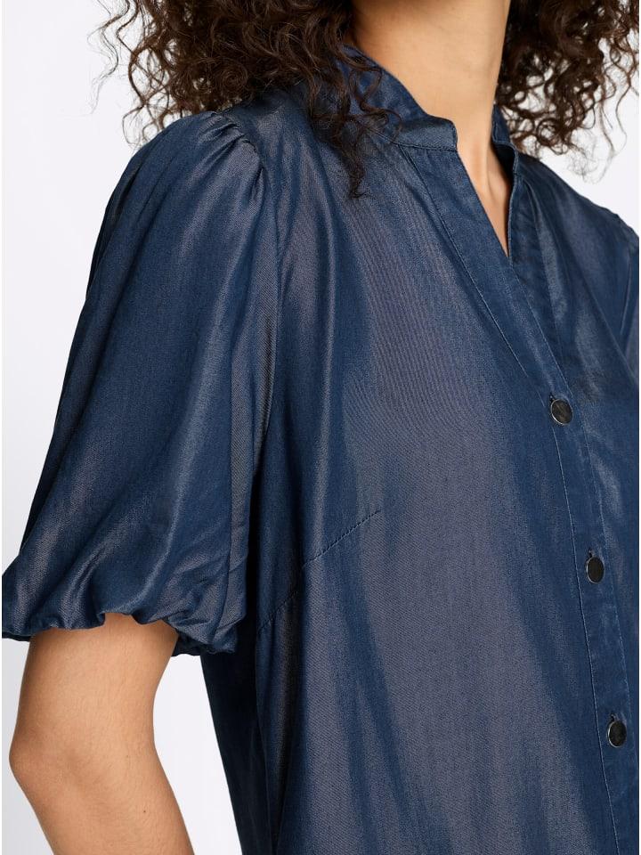 Платье свободного кроя из комфортной струящейся ткани. Воротник-стойка, круглый V-образный вырез и застежка на пуговицы по всей длине. Короткие рукава-фонарики, карманы в швах и складка сзади для увеличения ширины.