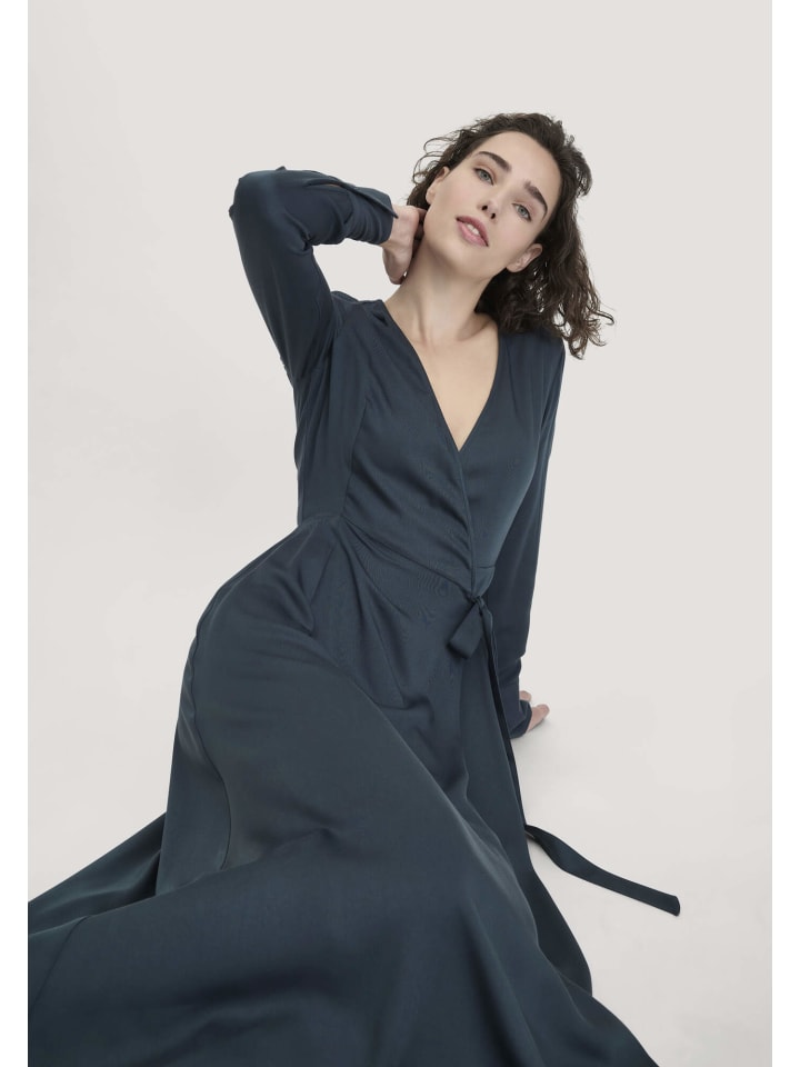 Стильное. Чувственное. Экологичная красота. Платье для особых случаев и повседневной носки, которое создает особенные ощущения. Благодаря крою с запахом, струящейся юбке и эффектным манжетам оно производит впечатление, оставаясь при этом естественным. Хорошо сидит, отлично выглядит и еще приятнее на ощупь.