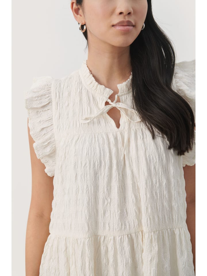 Платье миди без рукавов свободного, струящегося силуэта с оборками по краям пройм. Высокий вырез с завязывающимся поясом и многоуровневым подолом.
