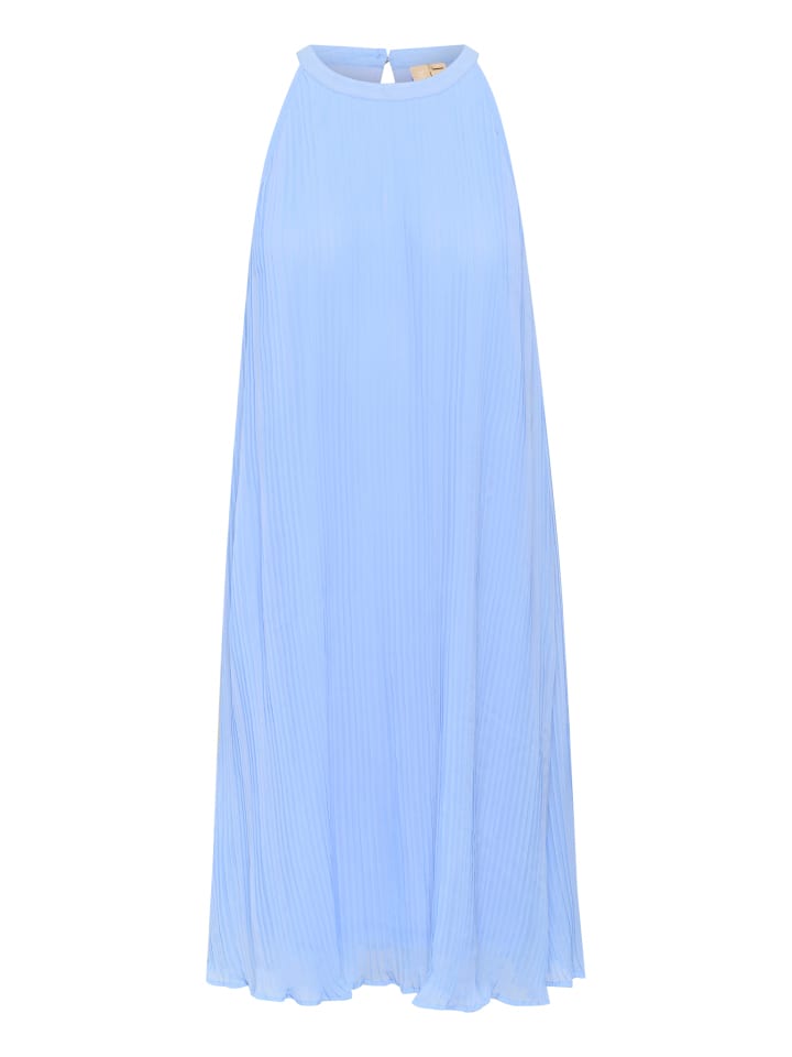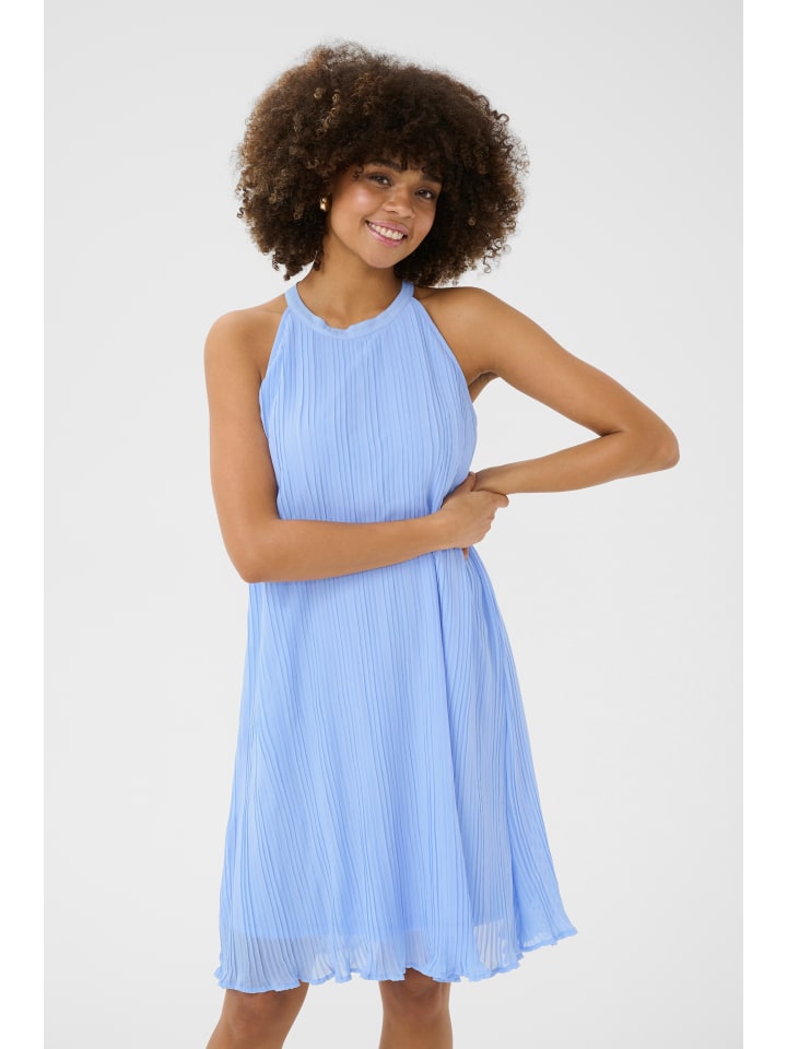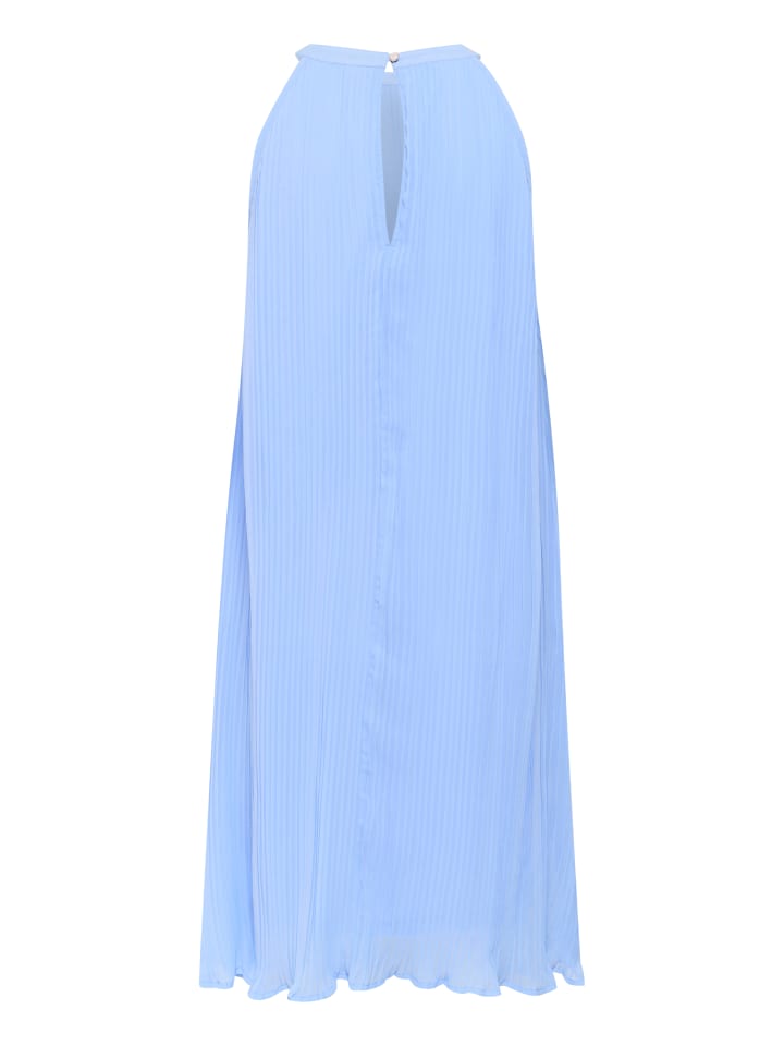 Платье без рукавов с плиссировкой, струящегося, без рукавов. Вырез-халтер и подол до колена создают динамичный, легкий силуэт.