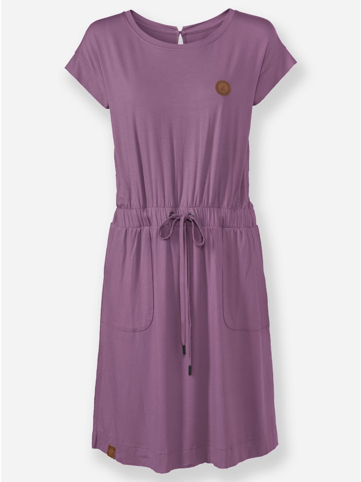 Ничего более повседневного и не бывает! И комфортнее не бывает! Это воздушное трикотажное платье с круглым вырезом, спущенными плечами и двумя накладными карманами застегивается на пуговицу сзади на шее. Декоративная нашивка из искусственной кожи украшает переднюю часть. Внутренний эластичный пояс с завязкой на талии создает привлекательный силуэт. Изготовлено из высококачественной ткани Lenzing ECOVERO.