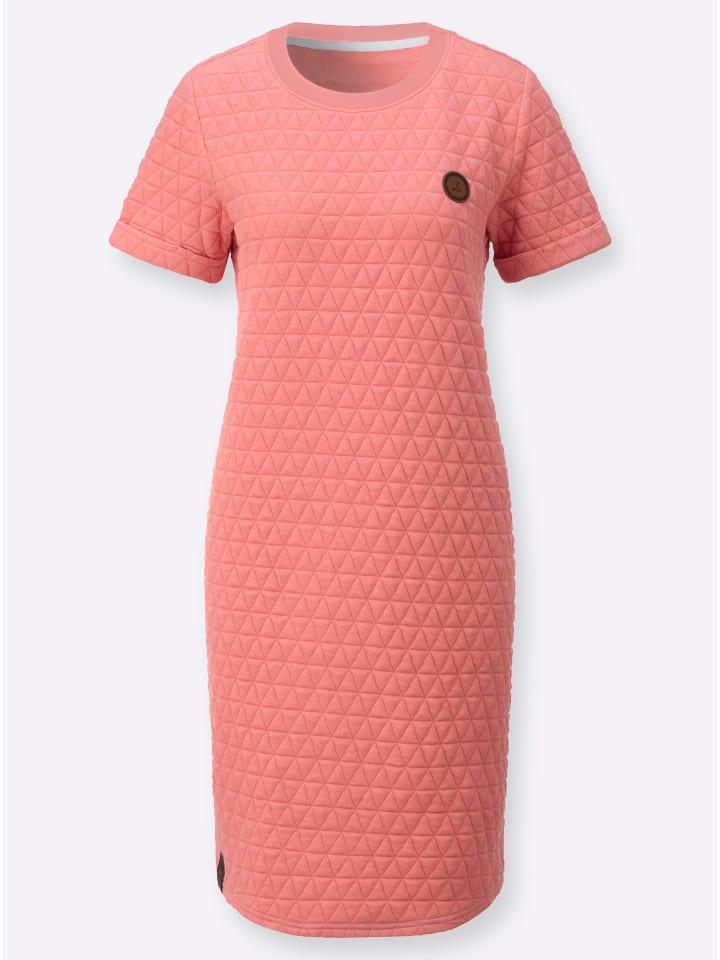 Очень повседневное и невероятно красивое! Жаккардовое платье с круглым вырезом в рубчик и пришитыми манжетами. Нашивка с логотипом из искусственной кожи на уровне груди. Абсолютно модный тренд: закругленный подол, который спереди немного короче, чем сзади.