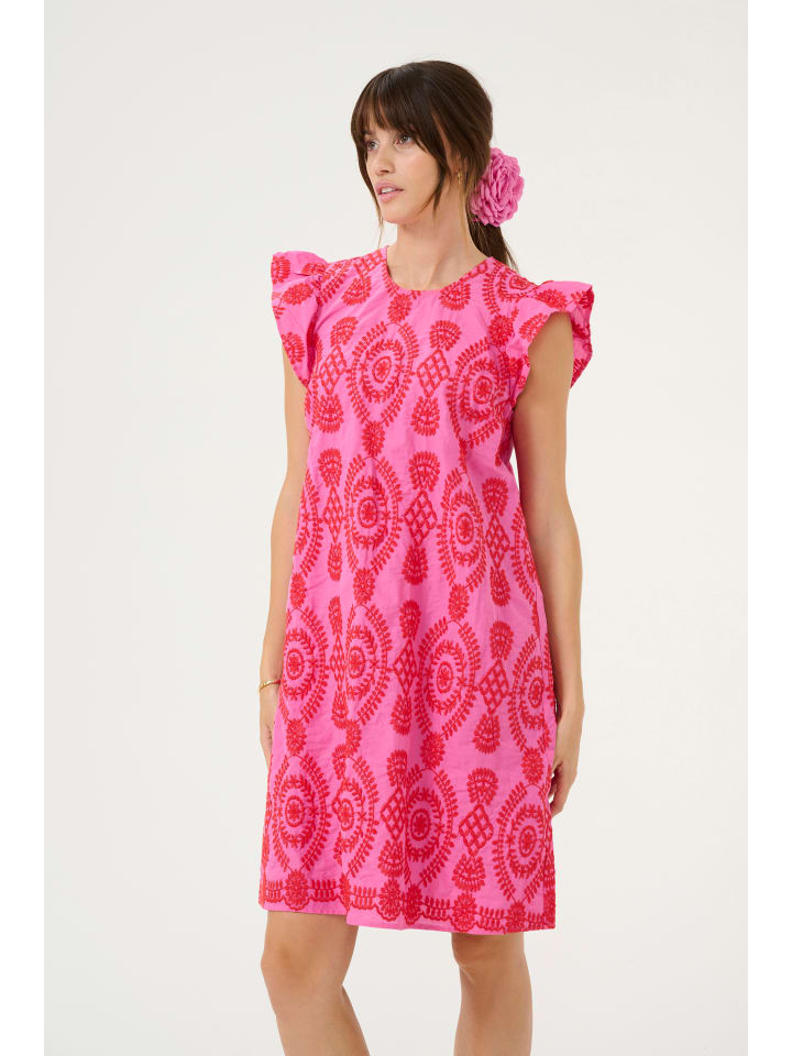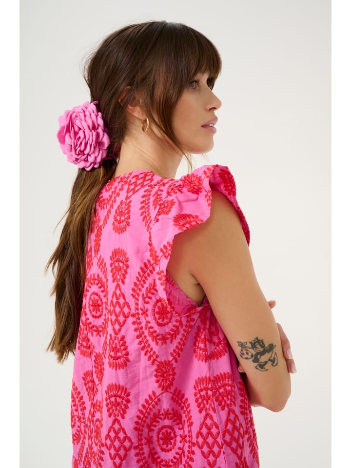 Короткое платье прямого кроя с круглым вырезом и эффектной фактурной вышивкой. Эффектные рукава с оборками и молния сзади дополняют дизайн.