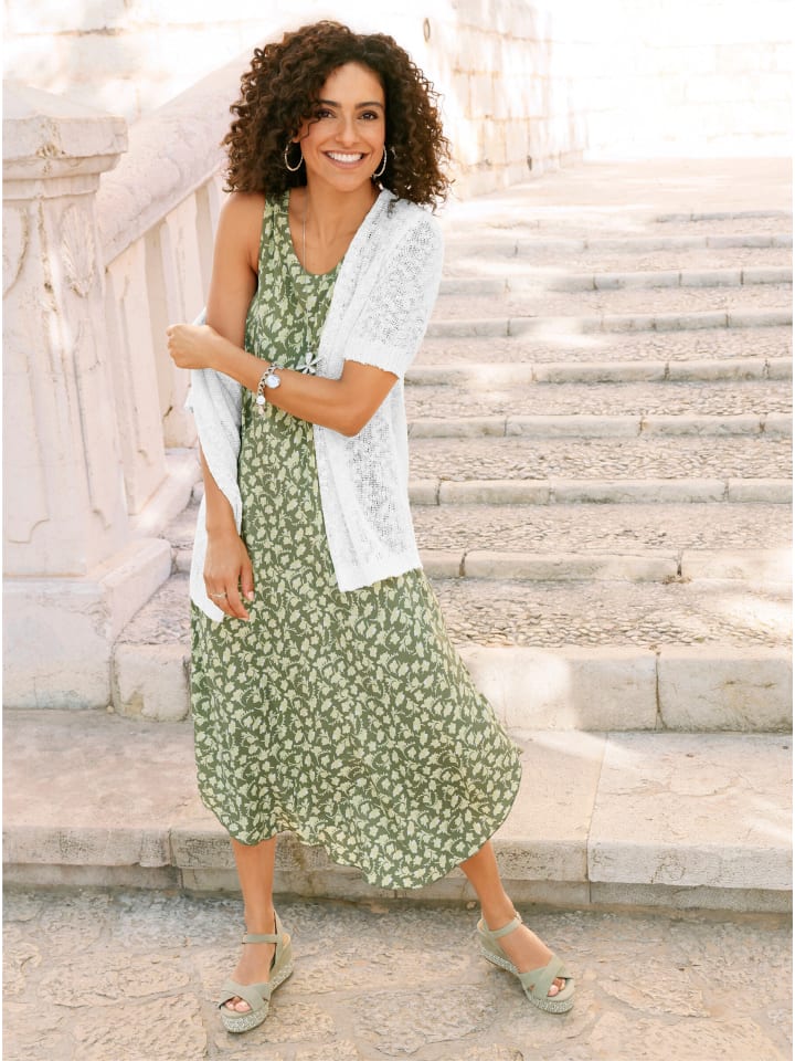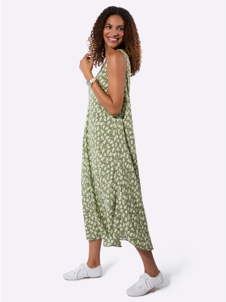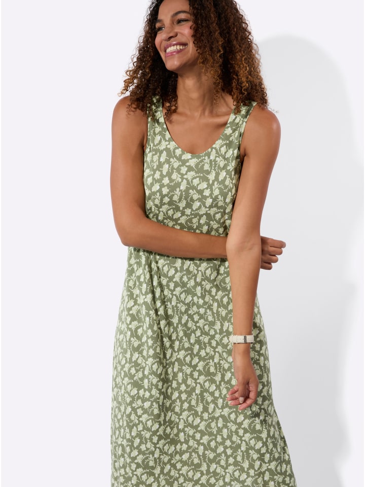 Это платье с принтом украшено цветами в особенно привлекательном стиле. Легко надевается, круглый вырез горловины и без рукавов. Закругленный подол. Комфортная вискоза качества ECOVERO от Lenzing.