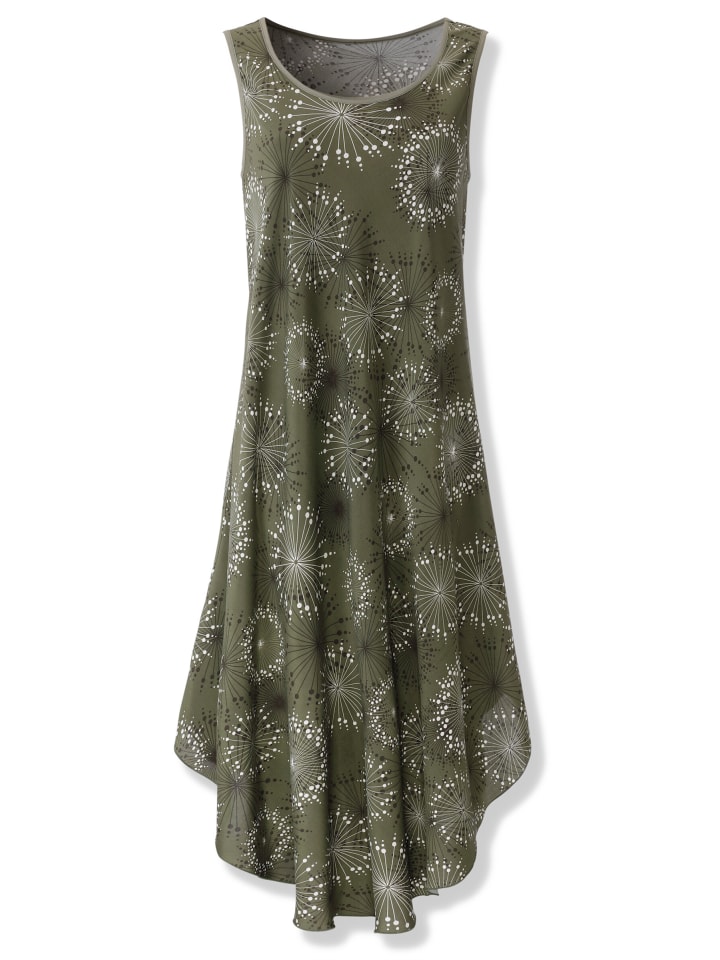 Идеальное платье для летних дней! Великолепный вид благодаря удлиненному асимметричному подолу и очаровательному цветочному узору. Воздушное и легкое благодаря безрукавному крою с круглым вырезом и струящемуся силуэту. Струящаяся ткань. Отделка однотонной окантовкой по круглому вырезу и проймам.