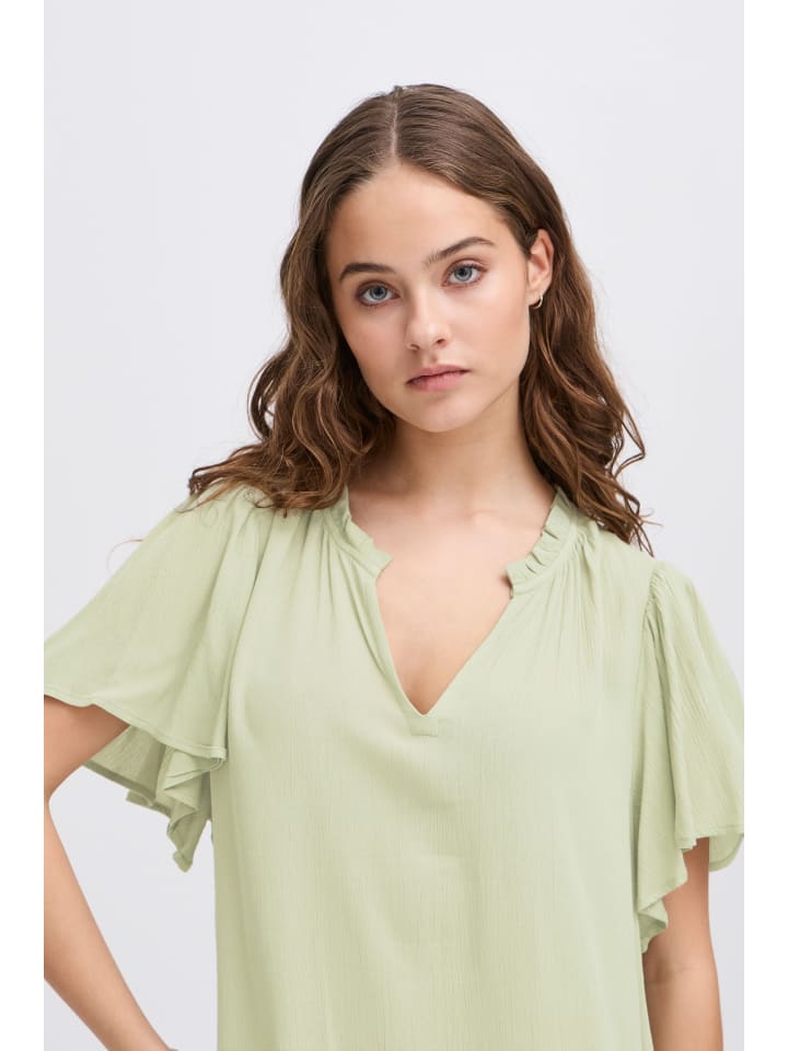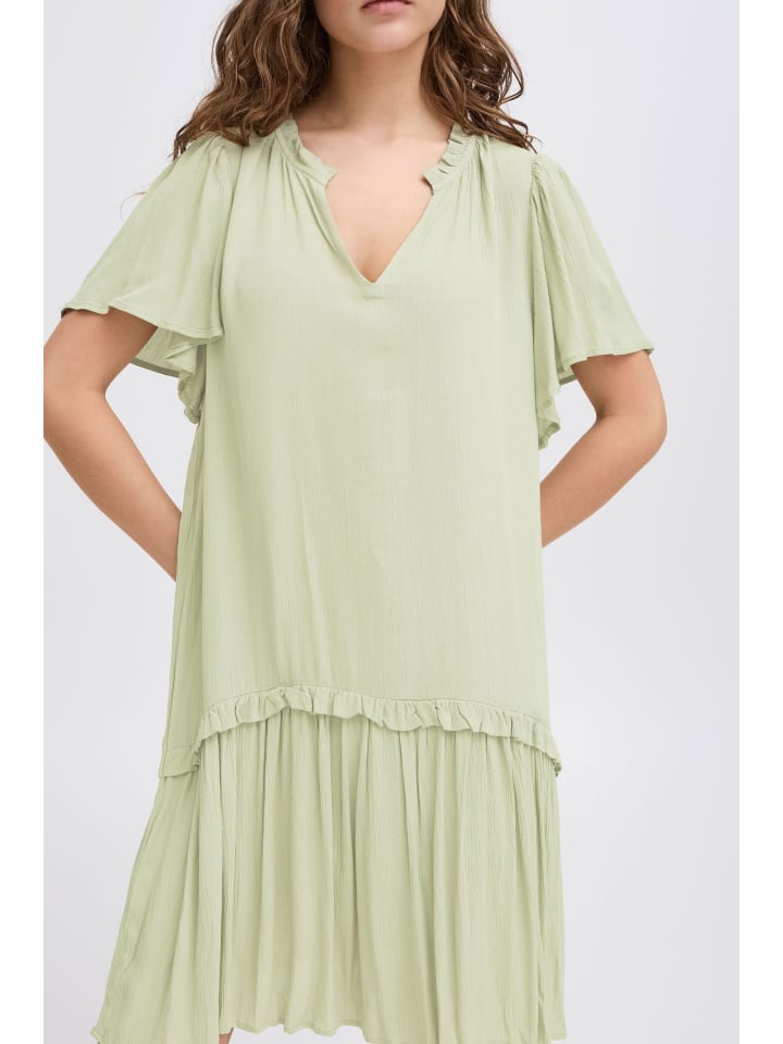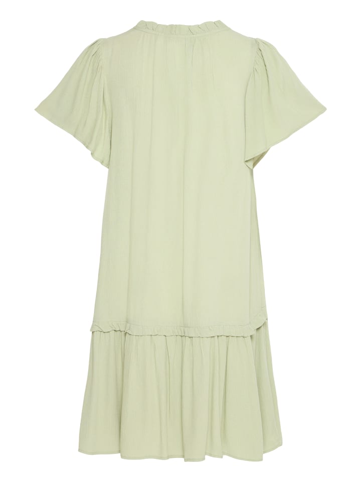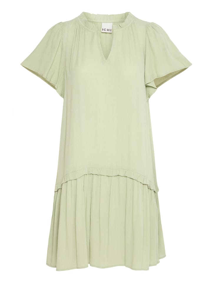 Платье с короткими рукавами, прямым силуэтом, присборенным V-образным вырезом и мягким оборчатым подолом. Легкая текстура придает сдержанную элегантность.