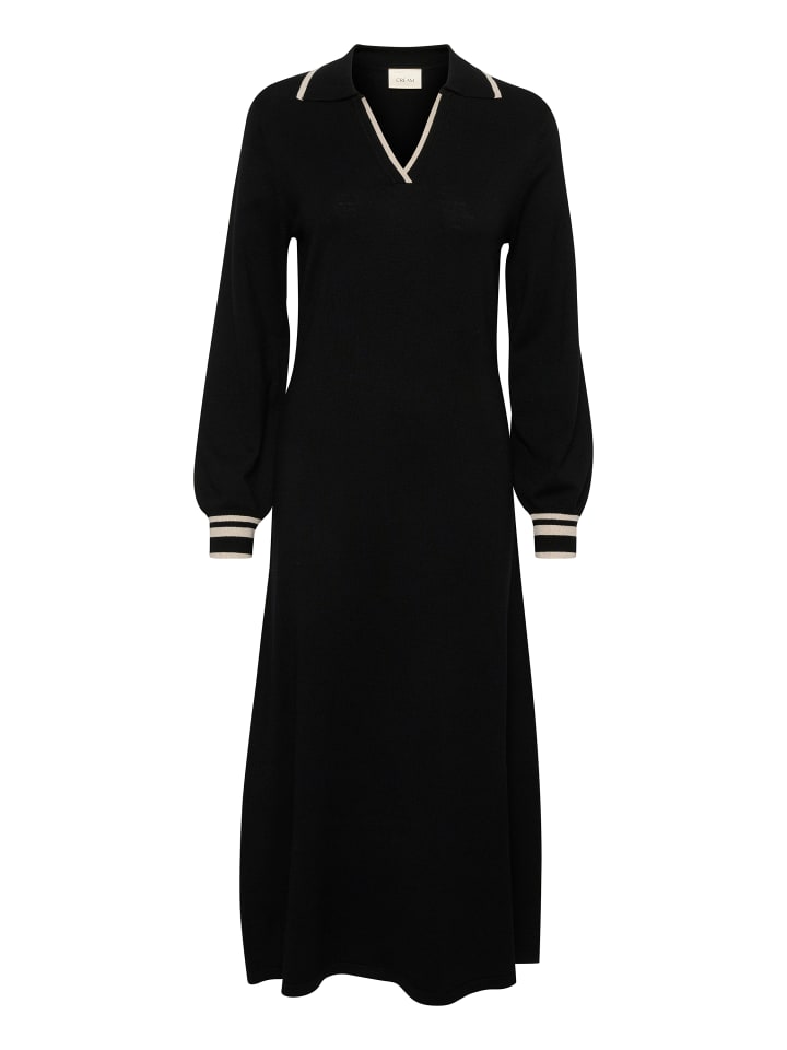 Платье миди прямого силуэта, мягкий крой, контрастный воротник-поло, V-образный вырез и длинные рукава с полосатыми манжетами.