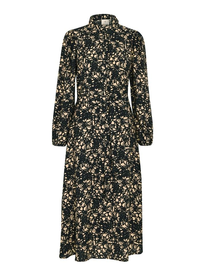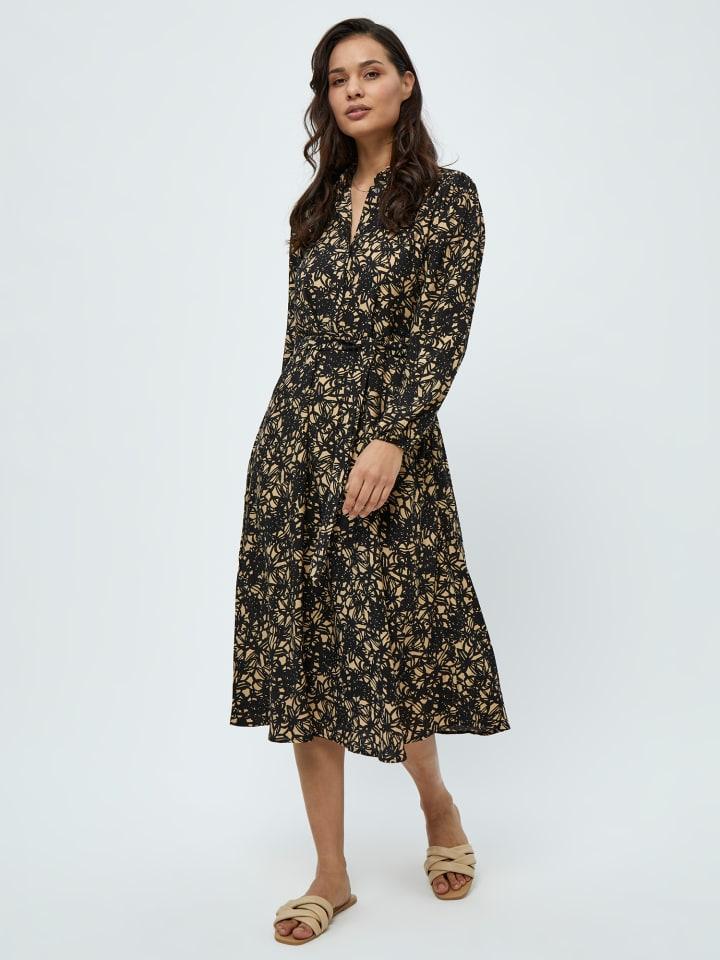 Платье миди с принтом, эластичными манжетами и рукавами-буфами. Платье имеет сборку на плечах и съемный пояс на талии.