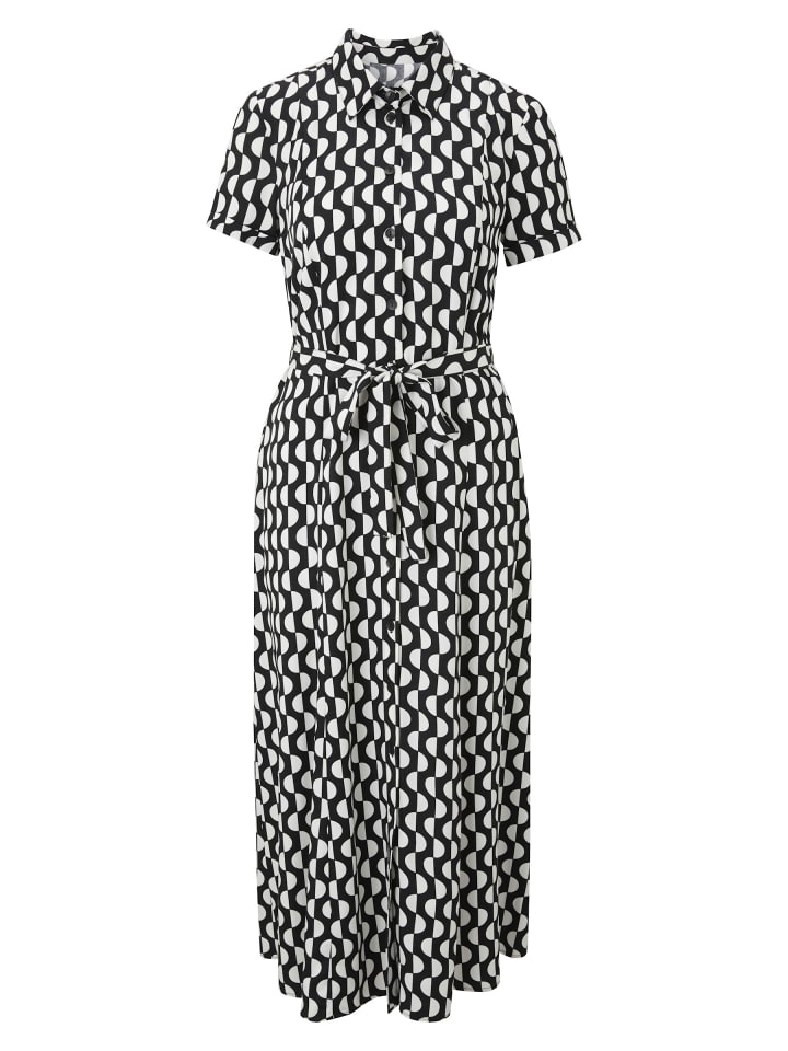 Простой фасон платья-рубашки с современным принтом. Свободный, подчеркивающий фигуру крой, застежка на пуговицы и короткие рукава. В комплект входит тканевый пояс. Кожаный ремень в комплект не входит.