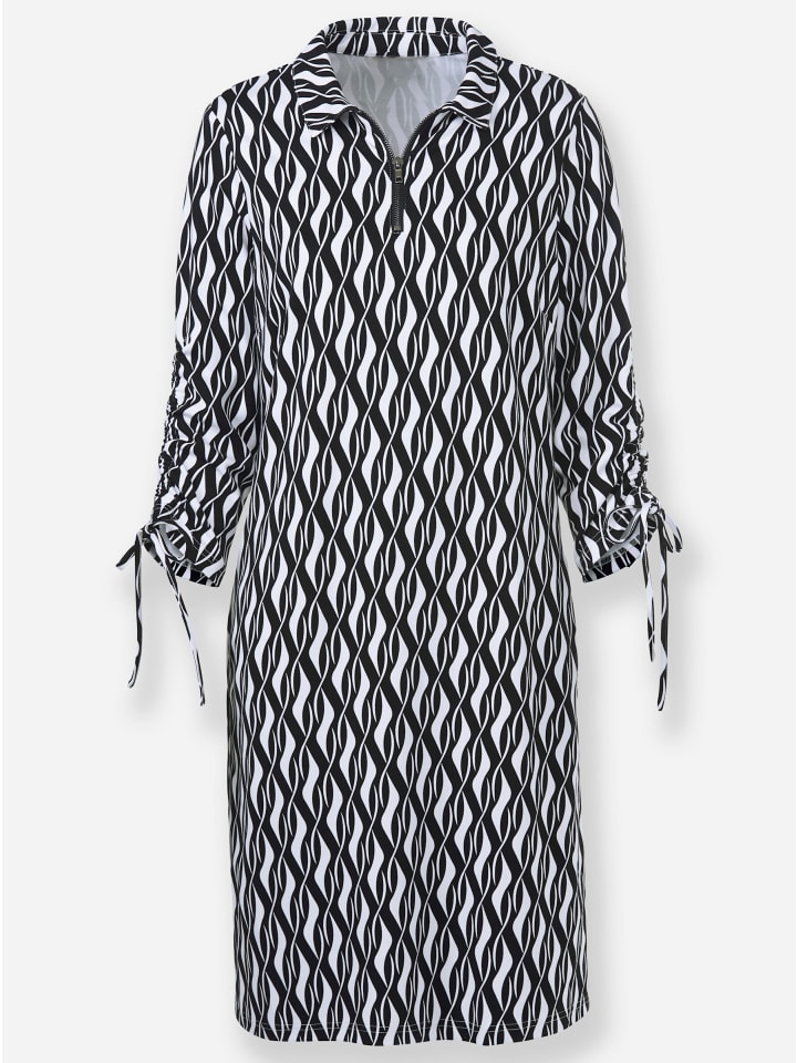 Платье из джерси с модным графическим рисунком и слегка расклешенным силуэтом. Воротник-поло на молнии, рукава 3/4 с регулируемой кулиской для сборки. Карманы в швах.