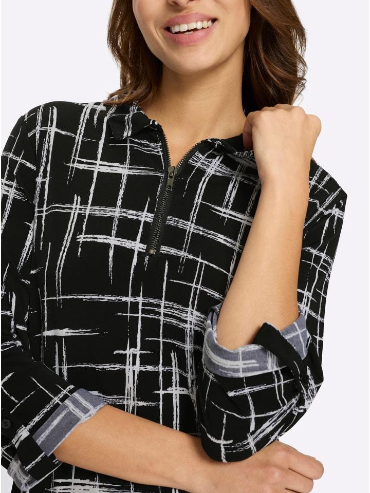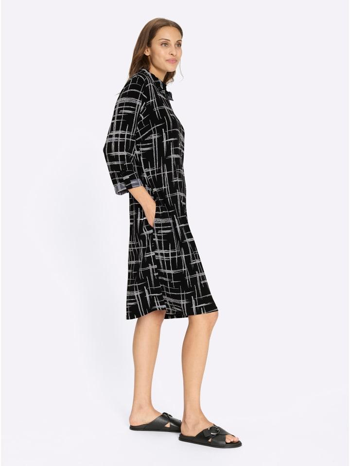 Это платье с принтом, графичным дизайном и выгодно подчеркивающим фигуру А-силуэтом, в тренде. Оно имеет отложной воротник и короткую молнию, карманы в боковых швах и длинные закатанные рукава. Длина рукавов три четверти регулируется с помощью хлястика и пуговицы. Изготовлено из переработанного полиэстера.