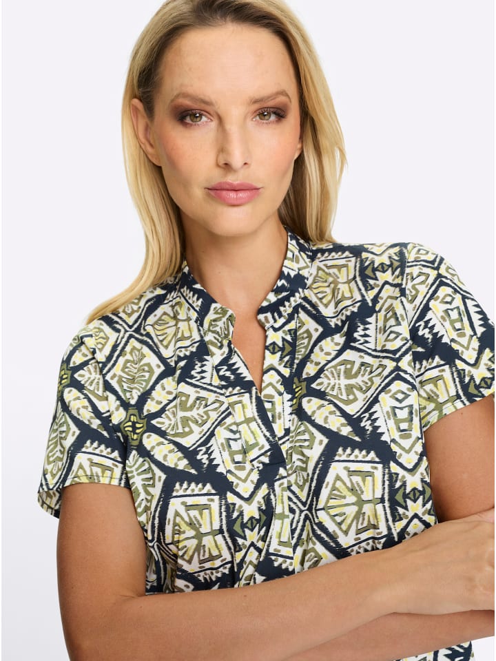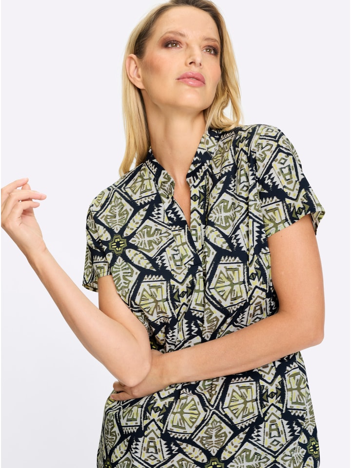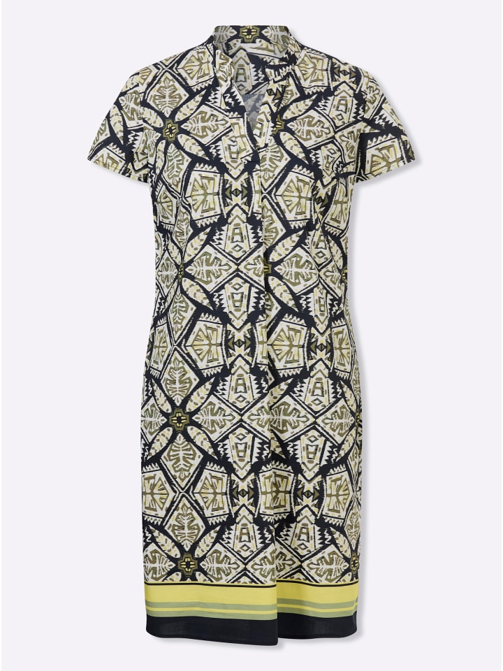 Платье с принтом и эффектным каймой. Изготовлено из эластичной ткани. Отложной воротник, круглый вырез с открытым V-образным вырезом и складкой спереди. Сзади заложена плоская складка. Поддерживает инициативу «Сделано в Африке» (Collot made in Africa).
