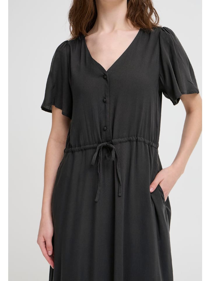 Платье миди с короткими рукавами, V-образным вырезом, планкой на пуговицах и завязкой на талии. Свободный крой с боковыми карманами для дополнительной функциональности.