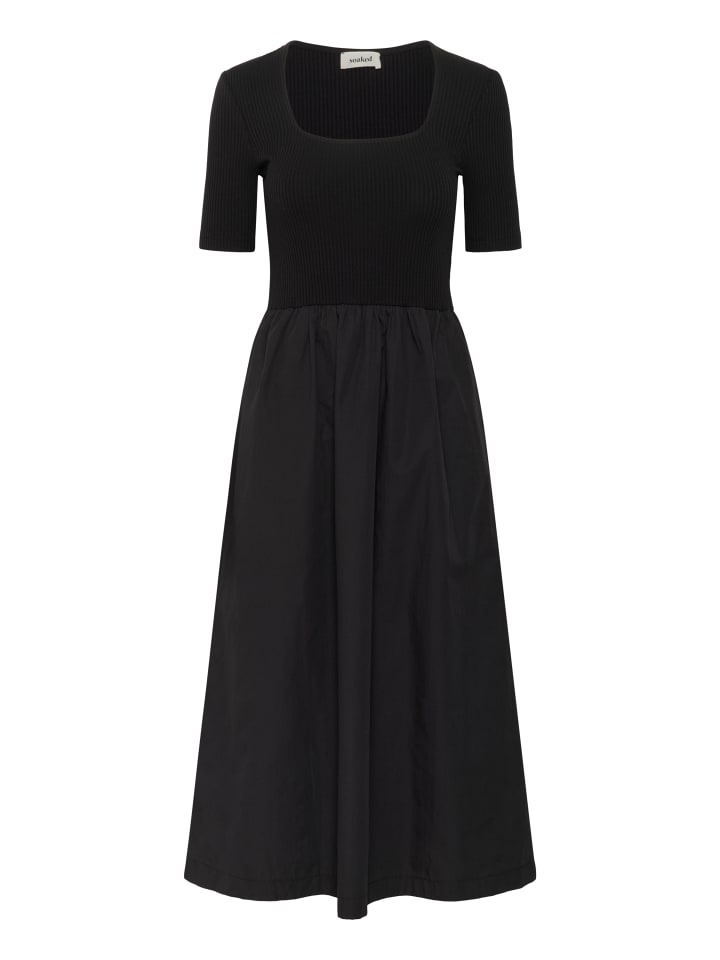 Современное платье миди с облегающим лифом в рубчик и расклешенной юбкой в складку. Квадратный вырез и короткие рукава дополняют дизайн.