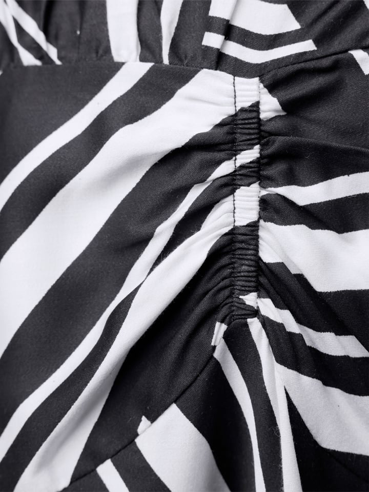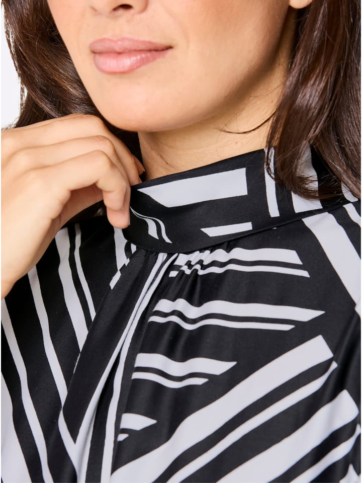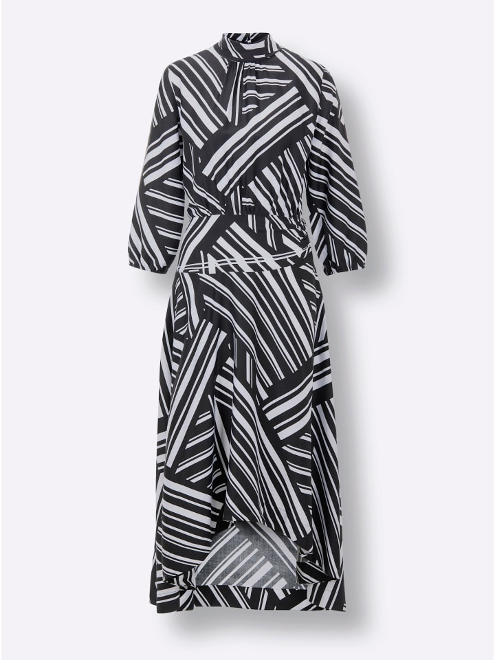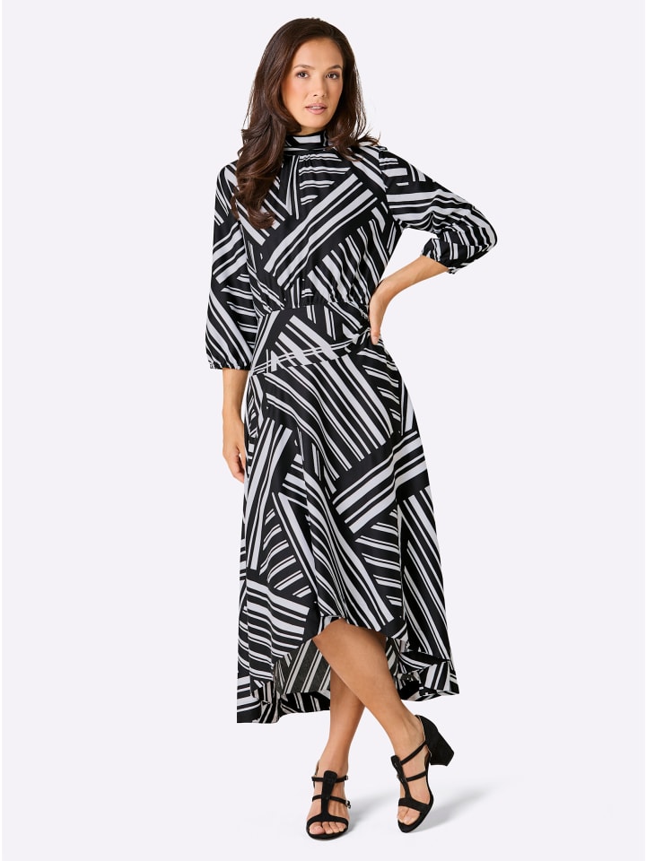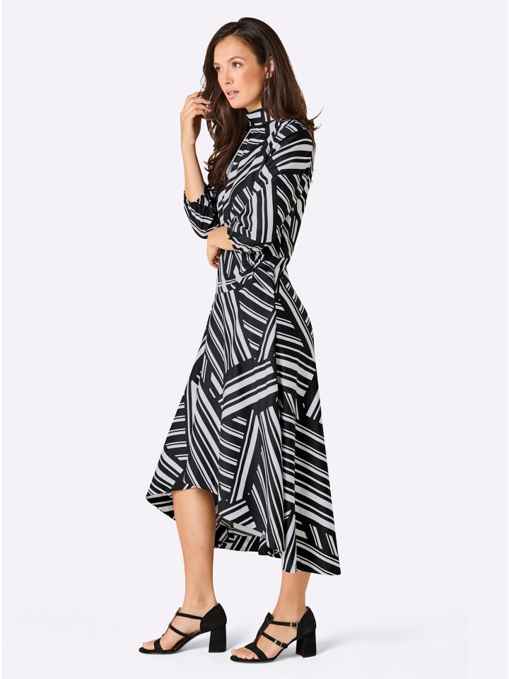 Это мягкое, эластичное платье из струящейся ткани из модала просто чудесно. Оно отличается высококачественным графическим дизайном, привлекательными сборками на талии и широкой струящейся юбкой, слегка укороченной спереди. Платье застегивается на потайную молнию и петлю-пуговицу сзади.