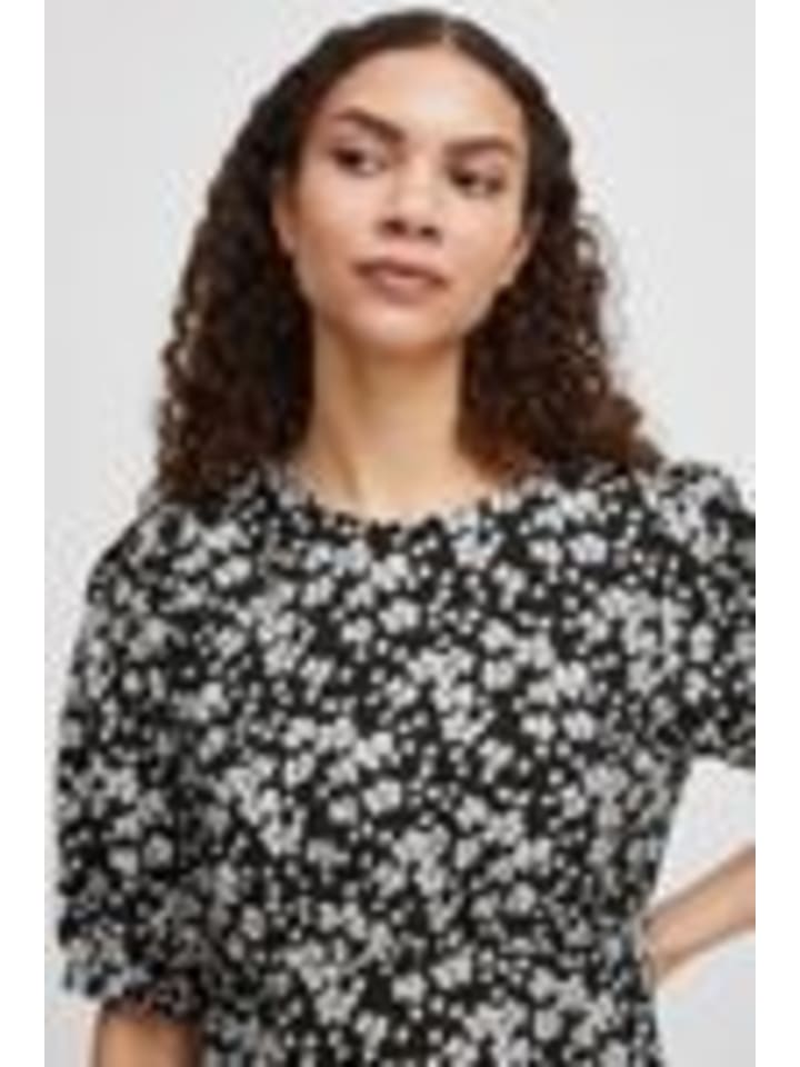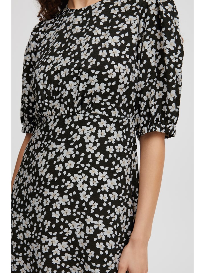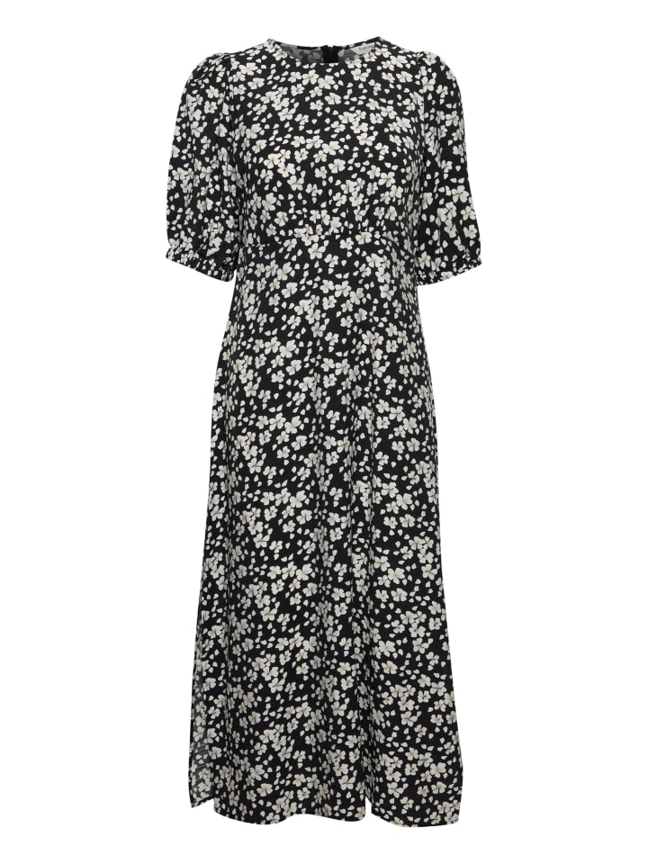 Платье миди с цветочным принтом по всей поверхности, круглым вырезом горловины, короткими рукавами-буфами и слегка расклешенным прямым кроем.