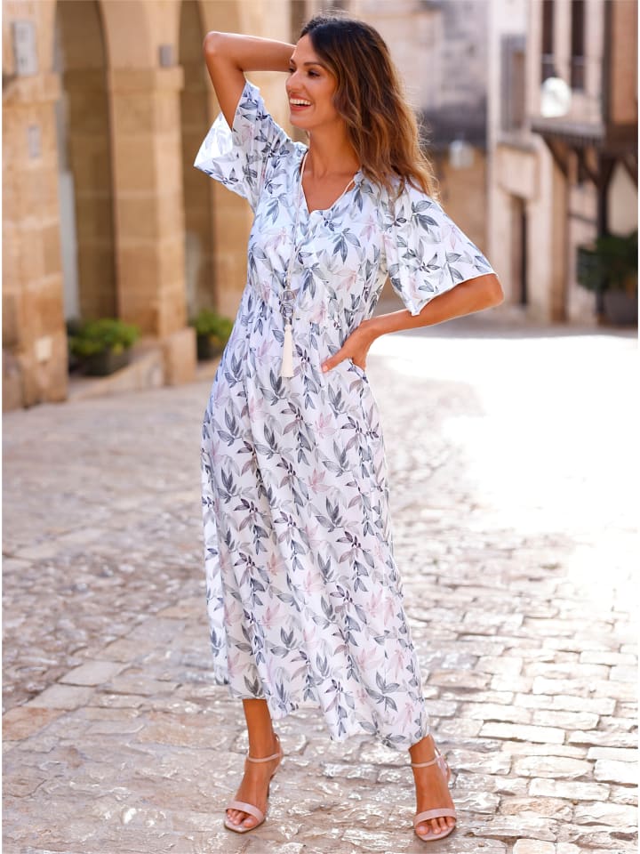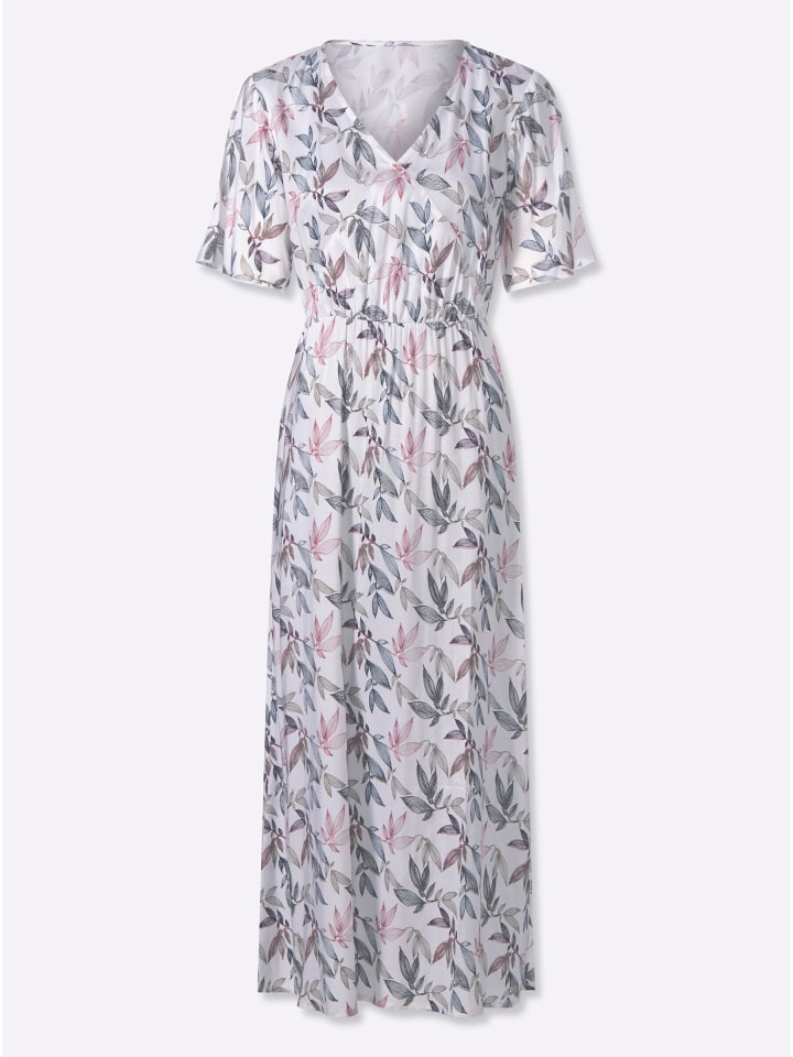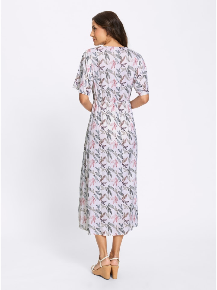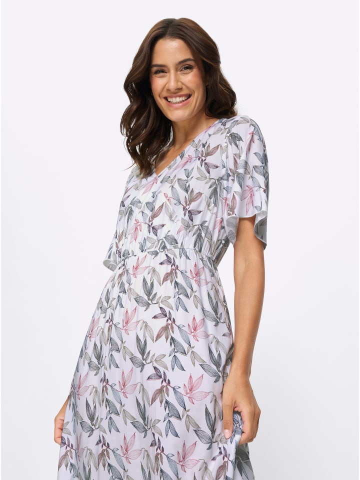 В этом платье с принтом мы не можем решить, что нам нравится больше: струящаяся вискозная ткань качества Lenzing ECOVERO, облегающий силуэт или гармоничный рисунок с листьями? Решайте сами. Платье имеет V-образный вырез с запахом и короткие струящиеся рукава. Эластичный пояс подчеркивает талию, не стесняя движений.