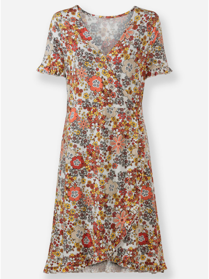 Модное трикотажное платье из гладкой, струящейся ткани с красивым цветочным принтом. V-образный вырез и закругленная юбка создают эффектный образ с запахом. Изысканная отделка включает небольшие оборки на концах коротких рукавов и по подолу. Талия корректируется швом. Изготовлено из вискозы Lenzing ECOVERO.
