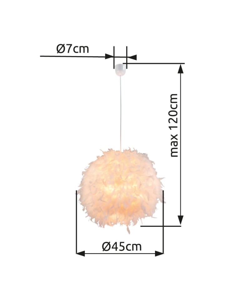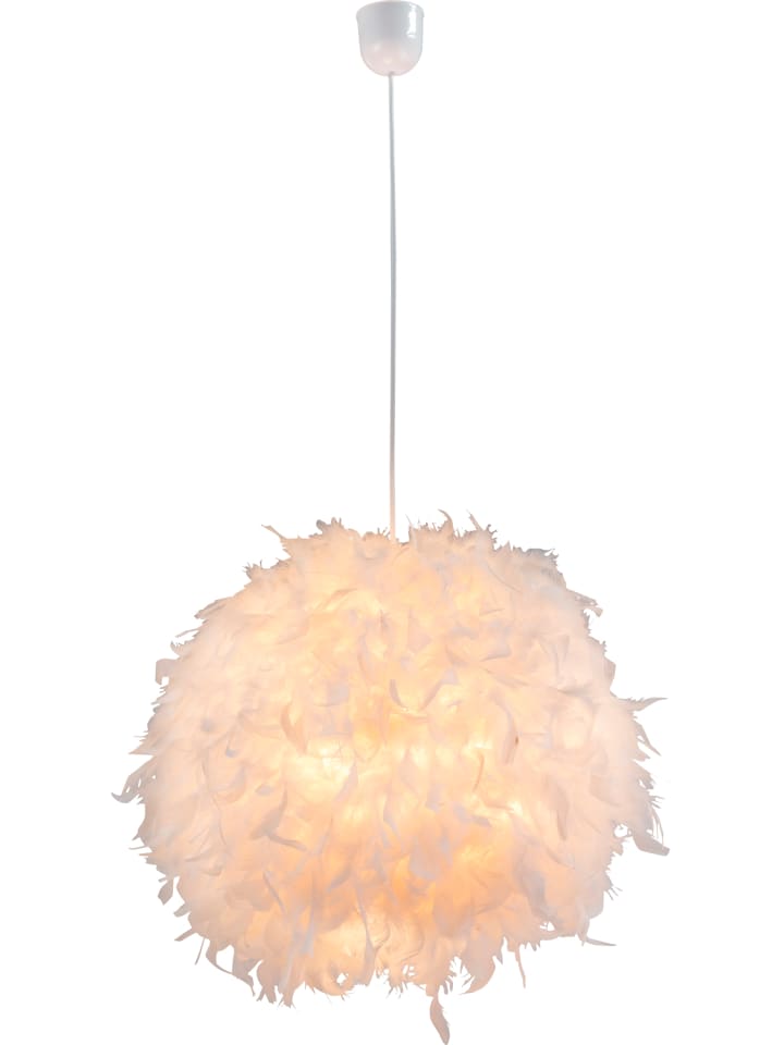 Подвесной светильник, белый пластик, белая ткань, прозрачный ПВХ-кабель, регулируемая высота, абажур с настоящими белыми перьями, подвес в комплекте, ø: 450 мм, H: 1200 мм, без 1 лампы E27 40 Вт 230 В