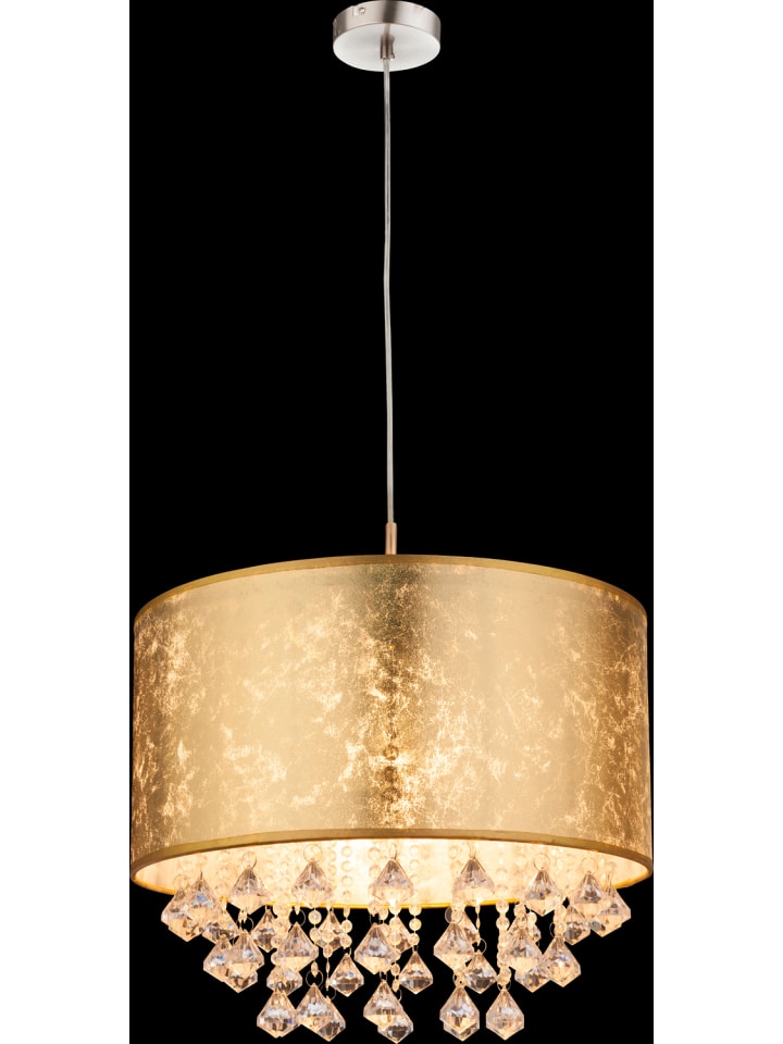 Подвесной светильник, металл, матовое никелевое покрытие, текстиль золотистого цвета, прозрачные пластиковые кристаллы, прозрачный ПВХ-кабель, регулируемая высота, подвес в комплекте, ø: 400 мм, H: 1400 мм, без 1 лампы E27 60 Вт 230 В