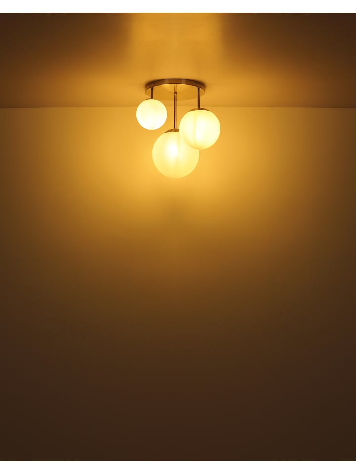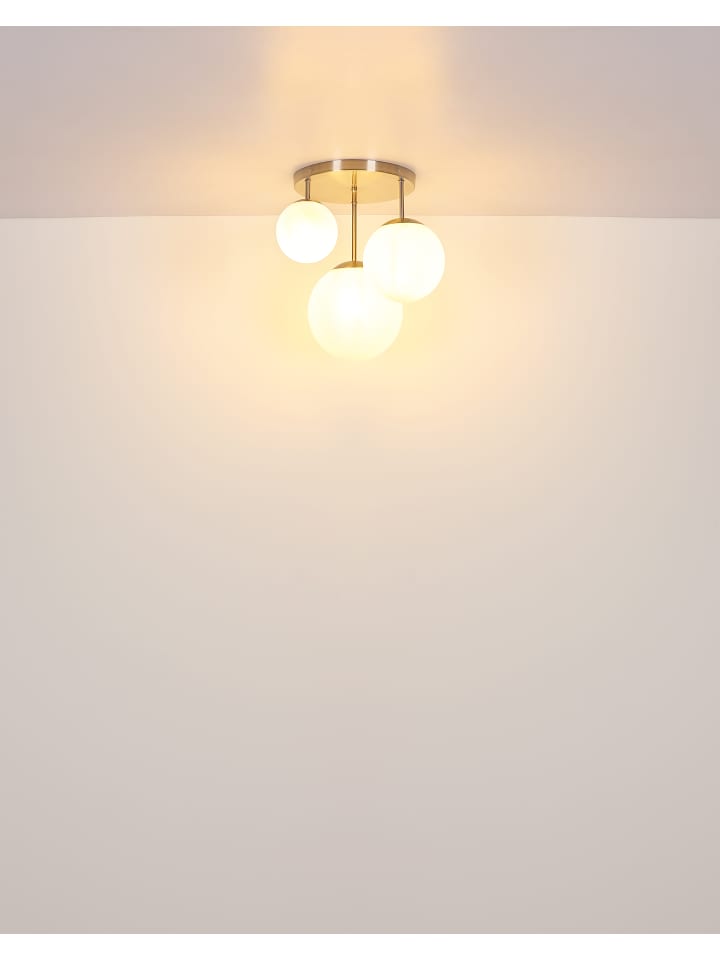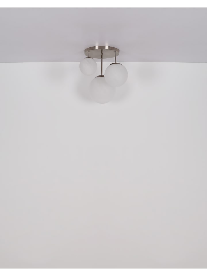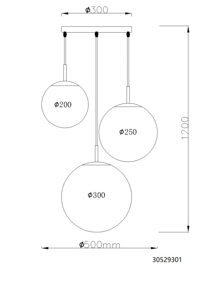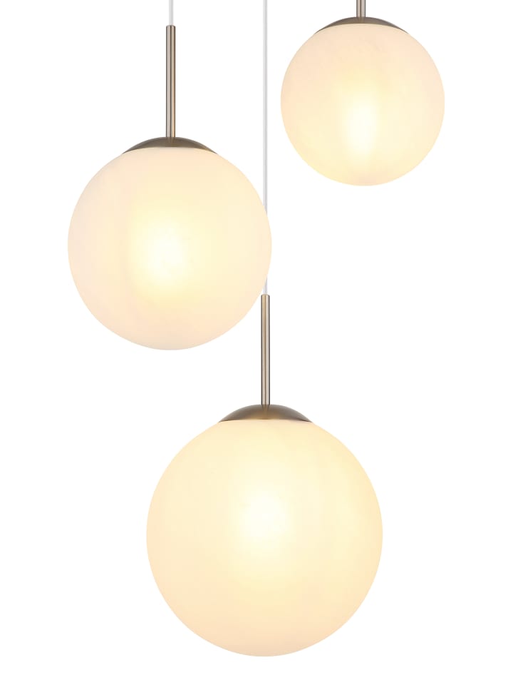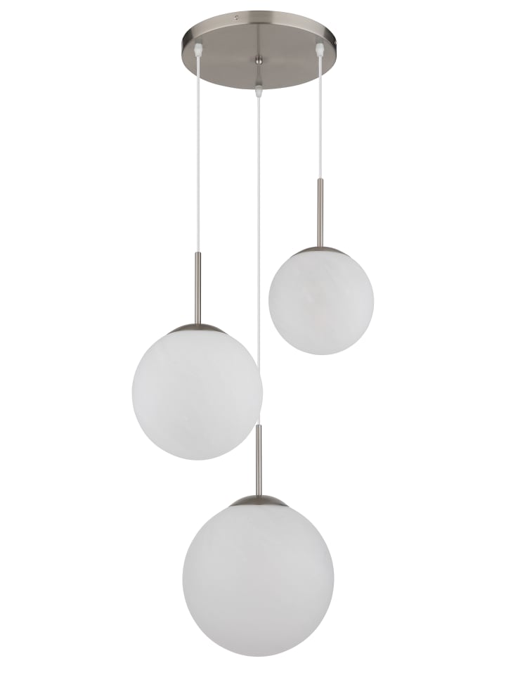 Подвесной светильник, металл, матовая никелевая отделка, стеклянные плафоны из опалового алебастра, прозрачный кабель из ПВХ, диаметр: 500 мм, высота: 1200 мм, диаметр стекла: по 1 штуке 20 см, 25 см, 30 см, без 3 ламп E27 60 Вт 230 В