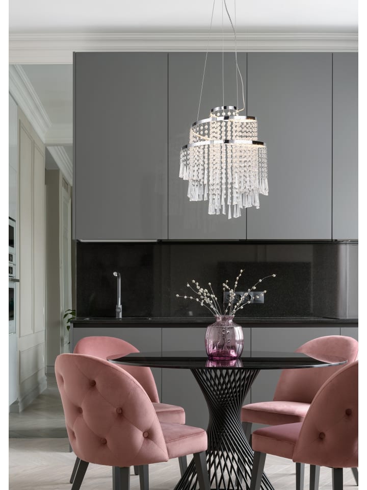 Подвесной светильник POMP - настоящая приманка для глаз, он станет центральным элементом любой гостиной или столовой благодаря своему изобилию блеска и гламура. Этот экстравагантный светильник украшен мерцающими пластиковыми подвесками, которые потрясающе преломляют свет, создавая завораживающие тени. Входящий в комплект пульт дистанционного управления позволяет удобно регулировать цвет и яркость освещения на расстоянии. Дизайн подвесного светильника выполнен из хромированного металла, а прозрачные акриловые камни добавляют гламурный штрих, ярко сверкая на свету. Кроме того, светильник использует современную светодиодную технологию, обеспечивающую высокое качество света и энергоэффективность. По сравнению с традиционными галогенными лампами, он позволяет экономить до 80% электроэнергии. Кроме того, светодиодные лампы обладают такими преимуществами, как длительный срок службы, низкое тепловыделение и экологичность.