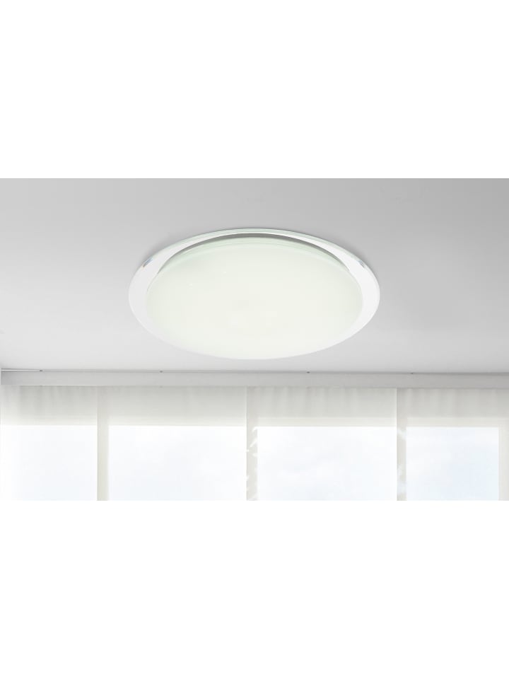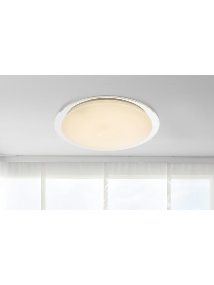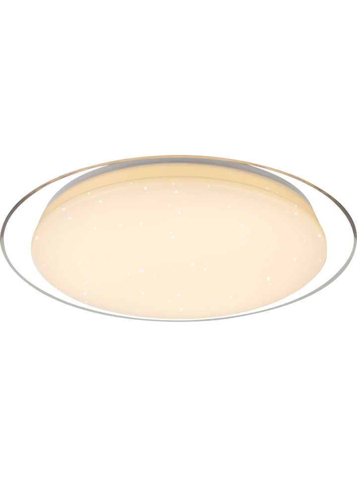 Потолочный светильник, белый металл, хромированный, сатинированный пластик, прозрачный акрил, регулировка яркости, несколько уровней с помощью настенного переключателя, блокировка цвета, функция памяти, ночник, таймер, пульт дистанционного управления, батарейки в комплекте (2 x AAA), ø: 450 мм, H: 70 мм, вкл. светодиод 30 Вт 230 В, источник света 360-3600 лм, световой поток 220-2200 лм, цветовая температура 2700-6500 K