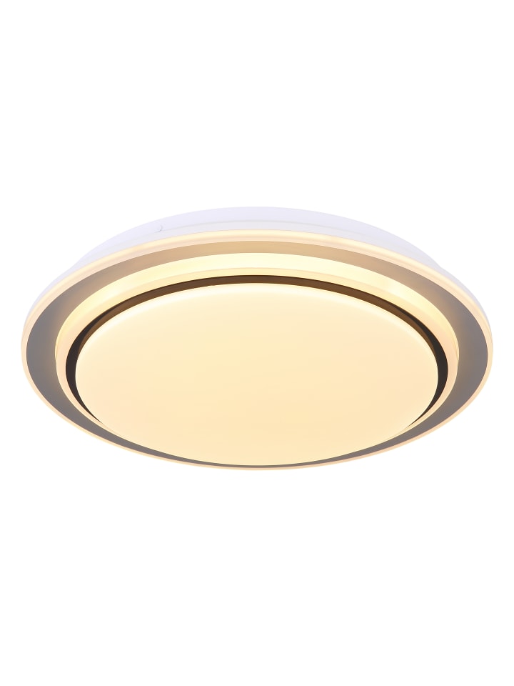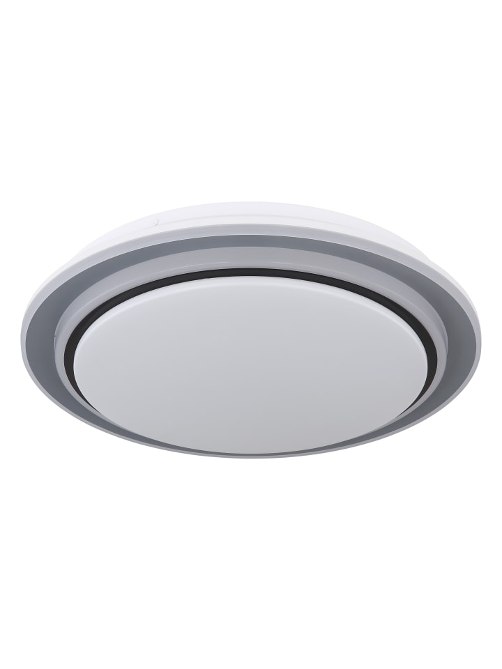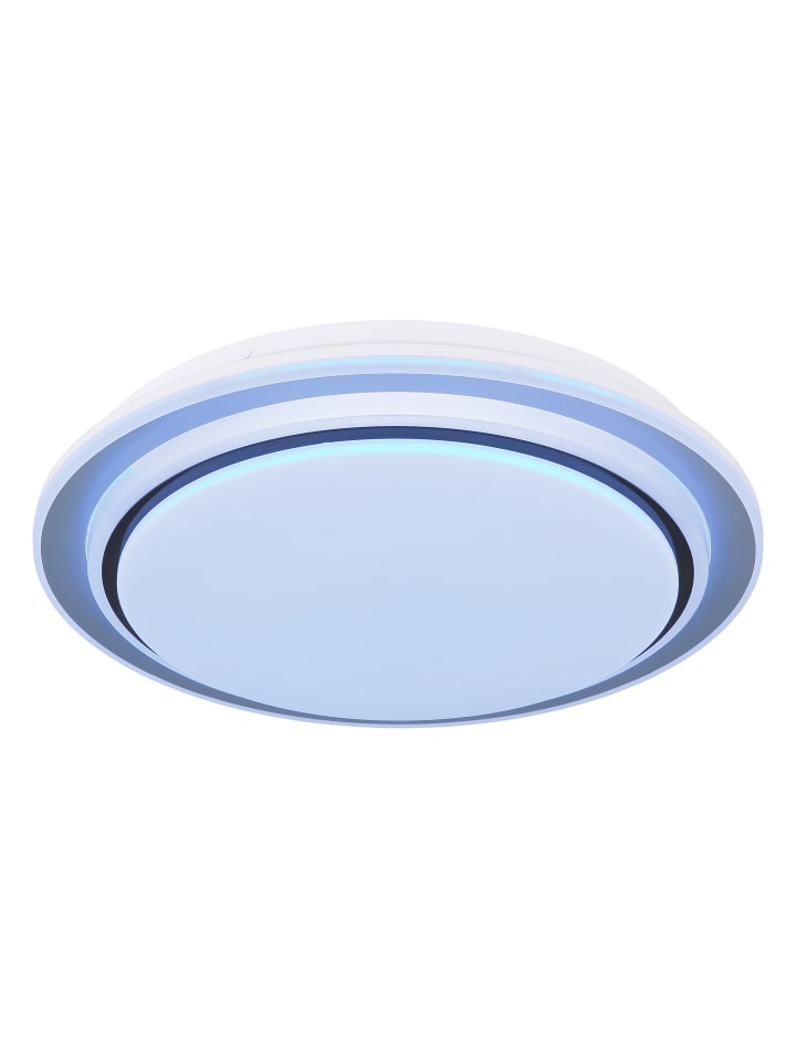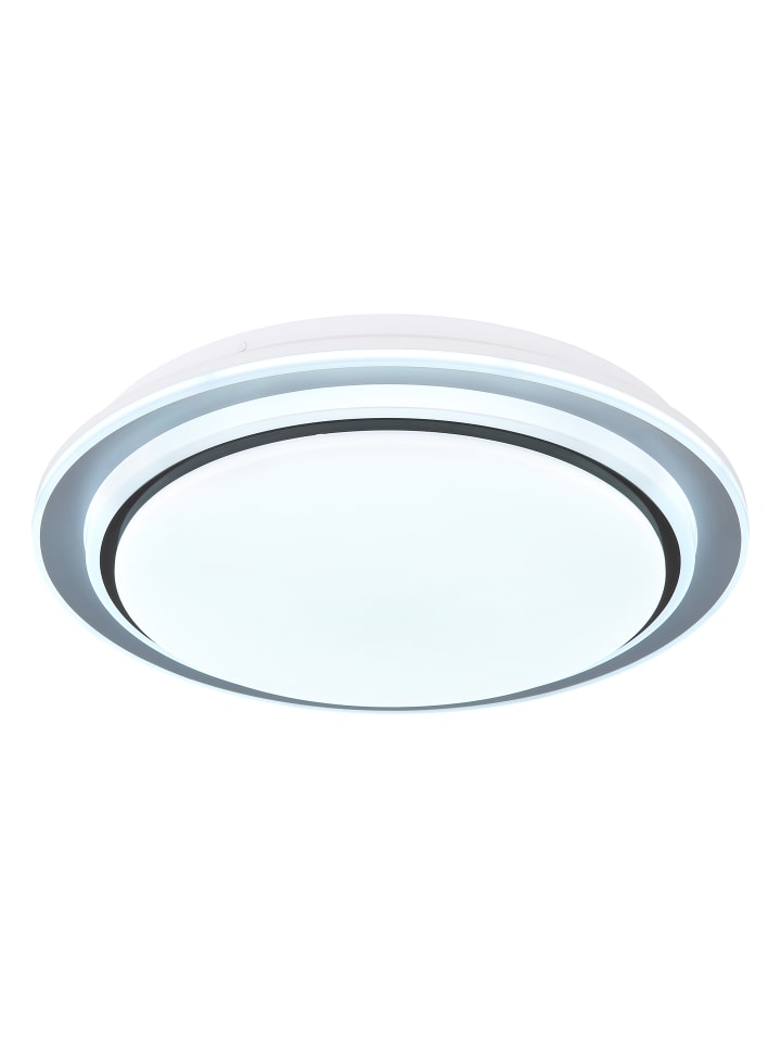 Потолочный светильник, матовый белый металл, опаловый акрил, матовый черный металл, регулировка яркости, несколько уровней яркости с помощью настенного переключателя, фиксированные цвета, RGB-преобразователь цветов, фиксированные RGB-цвета, функция памяти, ночник, таймер, пульт дистанционного управления, батарейки в комплекте (2 x AAA), диаметр: 400 мм, высота: 70 мм, в комплекте светодиод 24 Вт 230 В, источник света 258-2580 лм, световой поток 110-1100 лм, цветовая температура 2700-6500 К, в комплекте светодиод RGB 5 Вт 230 В