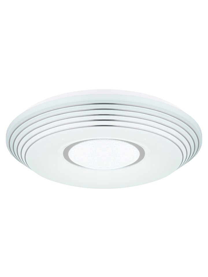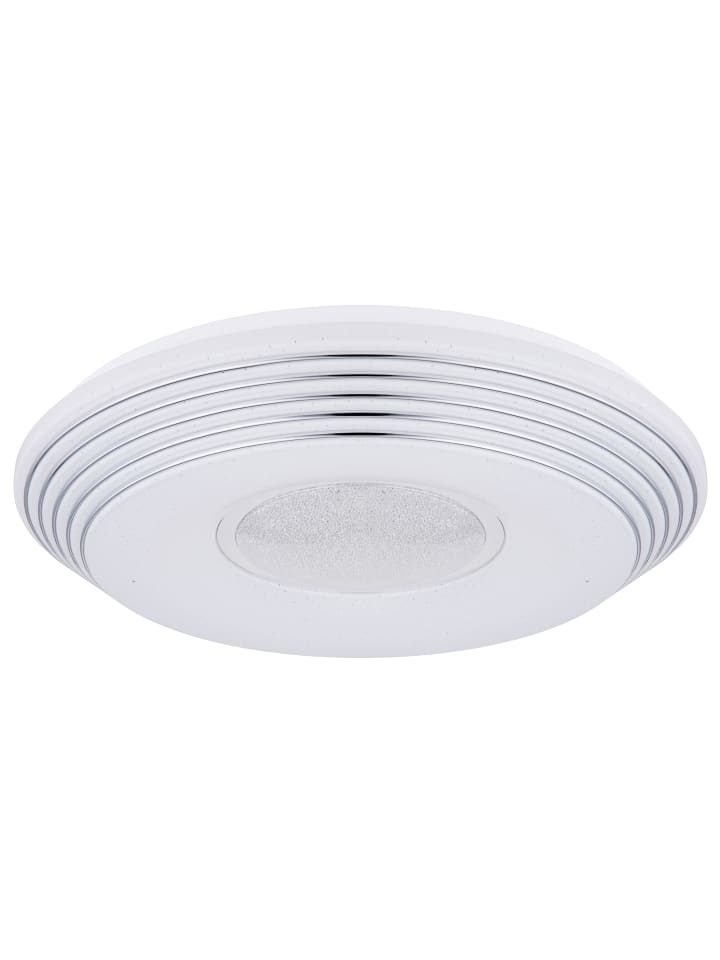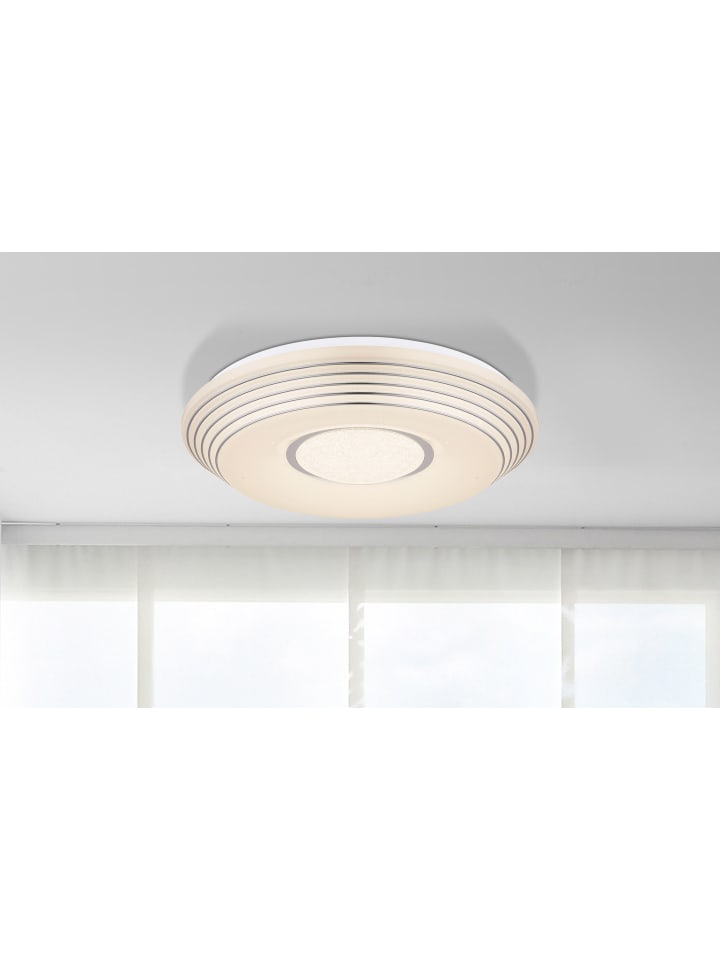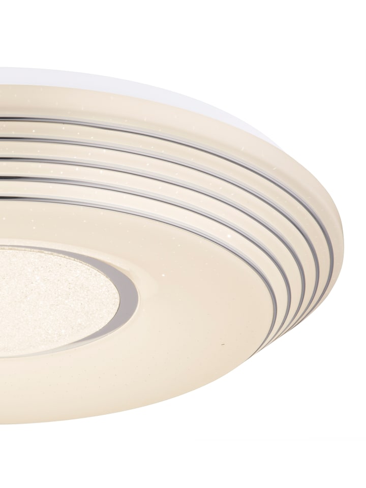 Потолочный светильник, белый металл, белый акрил, прозрачные пластиковые кристаллы, регулировка яркости, несколько уровней яркости с помощью настенного переключателя, блокировка цветов, функция памяти, ночник, пульт дистанционного управления, батарейки в комплекте (2 x AAA), ø: 500 мм, H: 85 мм, вкл. светодиод 40 Вт 230 В, источник света 300-5200 лм, световой поток 280-2620 лм, цветовая температура 3000-6000 K