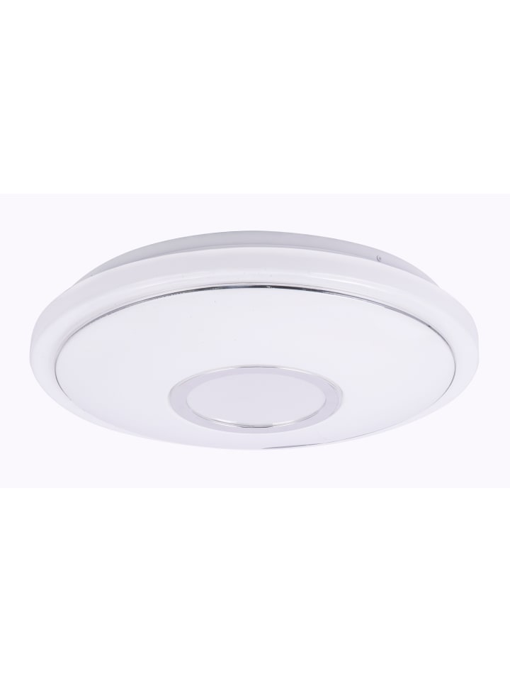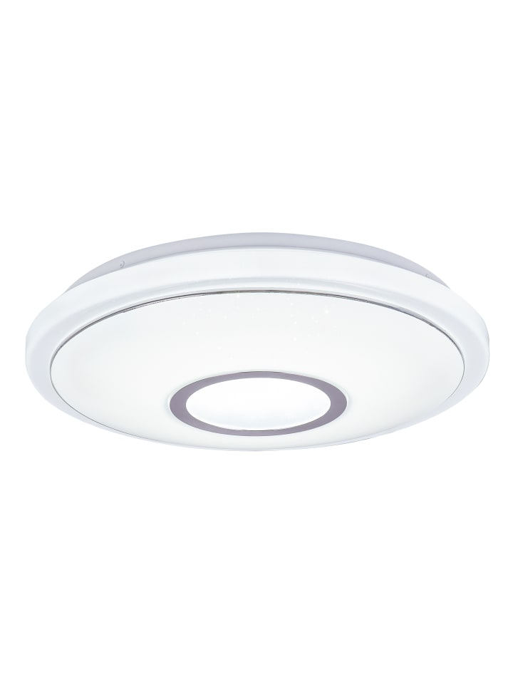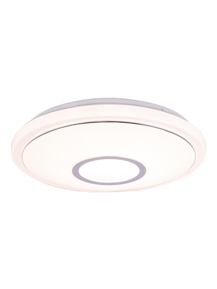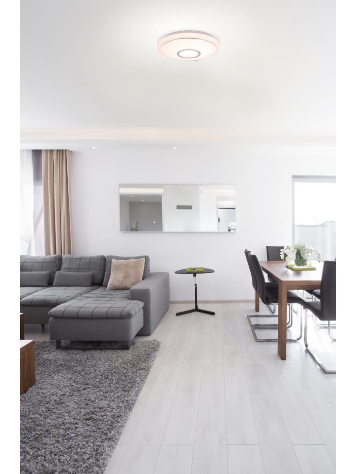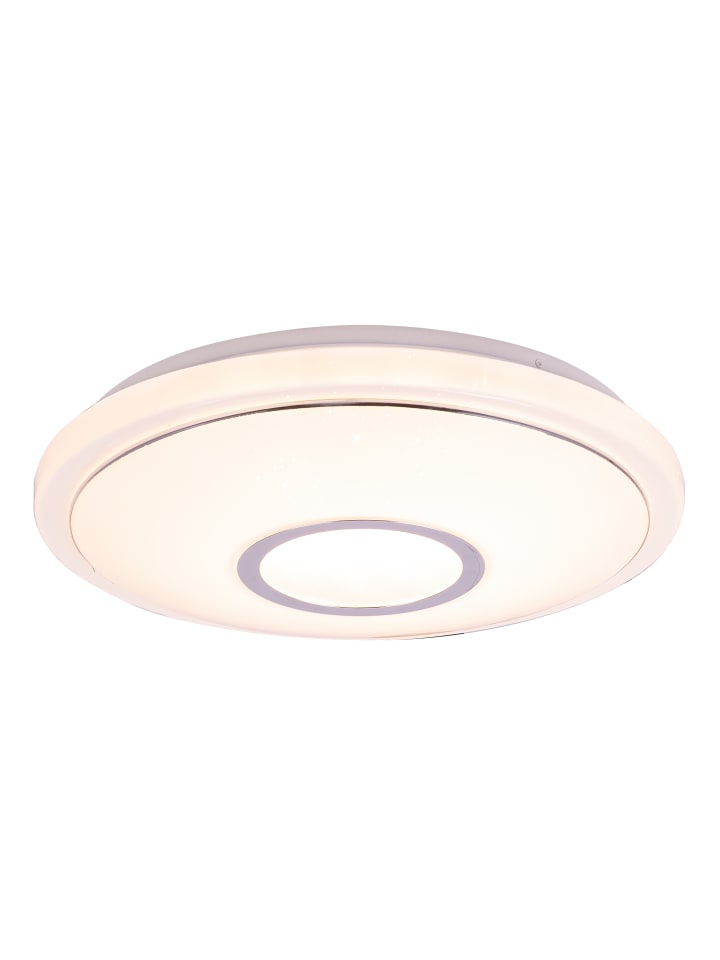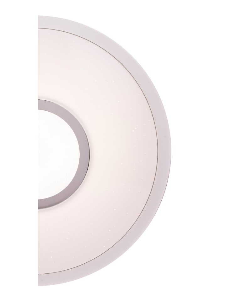 Потолочный светильник, белый металл, опаловый акрил с блестками, хромированное кольцо, несколько уровней яркости с настенным переключателем, возможность настройки цветов, диаметр: 400 мм, высота: 90 мм, в комплекте светодиод 16 Вт 230 В, источник света 1600 лм, световой поток 1300 лм, цветовая температура 2700/4200/6500 К