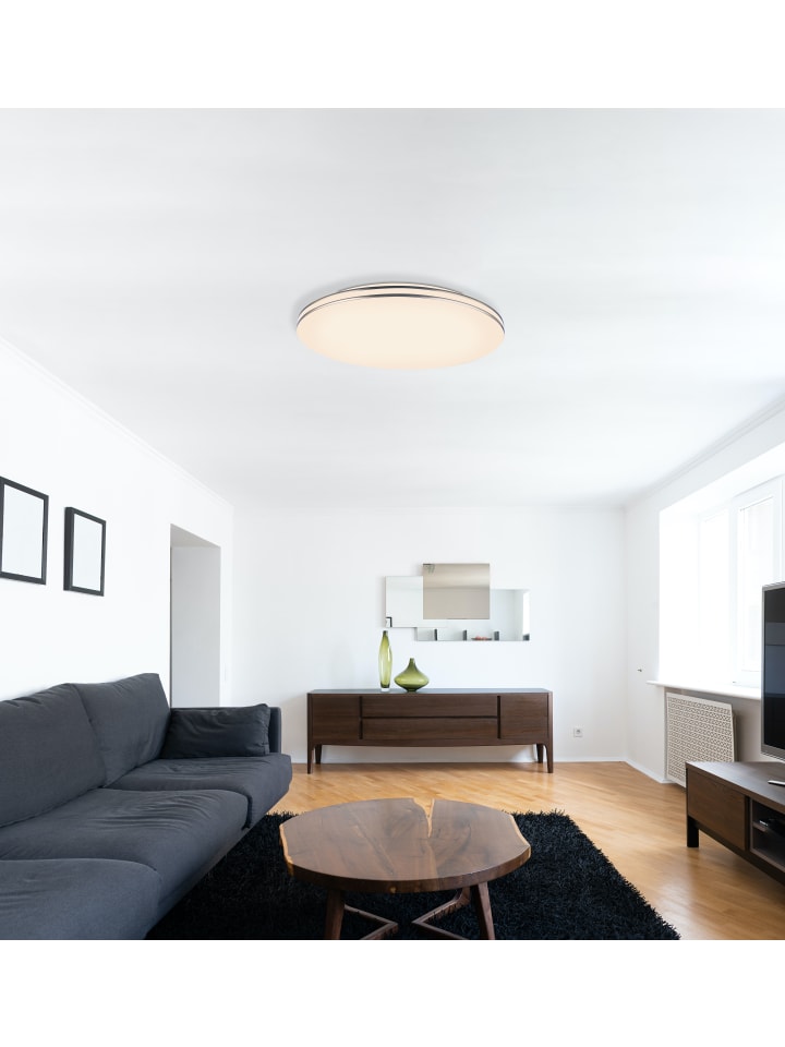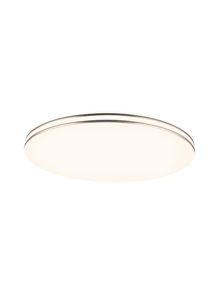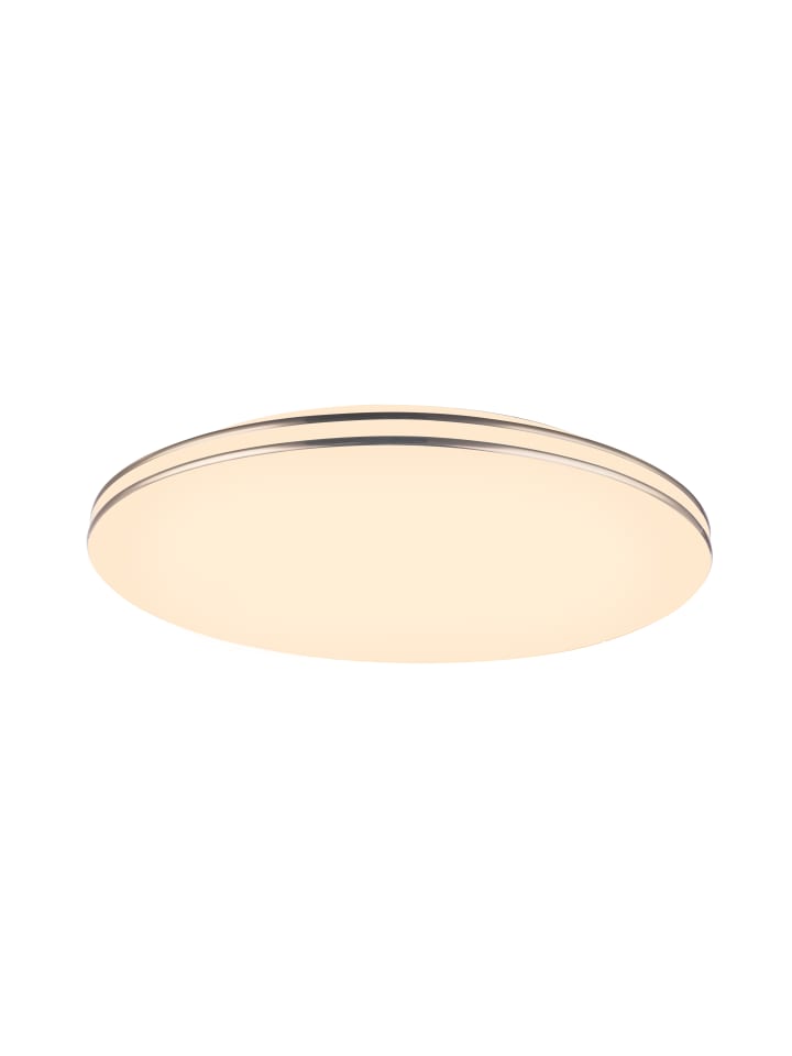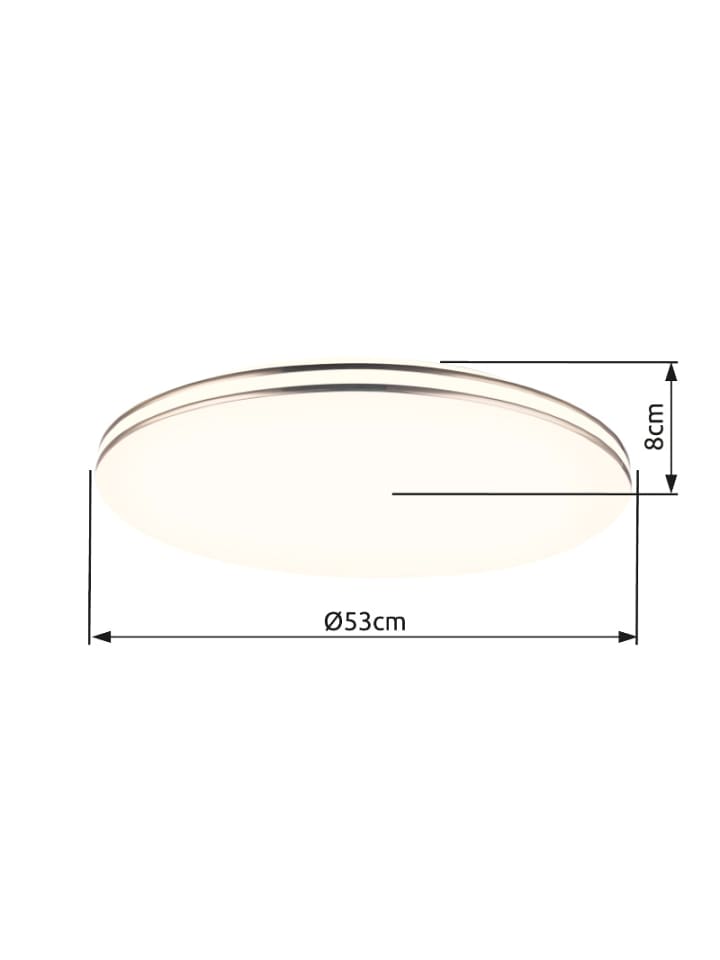 Потолочный светильник, белый металл, опаловый пластик, хромированное кольцо, регулировка яркости, блокировка цвета, функция памяти, ночник, пульт дистанционного управления, батарейки в комплекте (2 x AAA), ø: 530 мм, H: 80 мм, вкл. светодиод 48 Вт 230 В, источник света 540-5400 лм, световой поток 350-3500 лм, цветовая температура 3000-6500 K