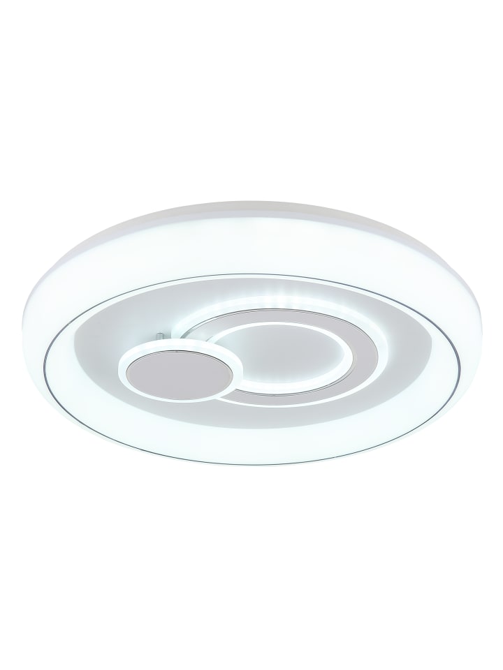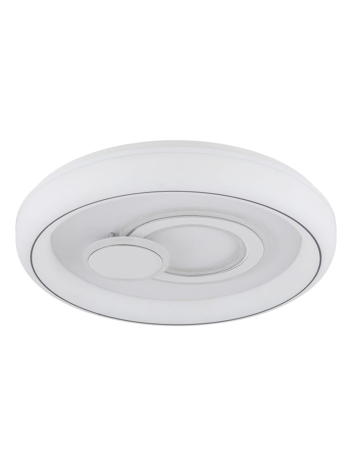 Потолочный светильник, матовый белый металл, опаловый акрил, опаловый пластик, хромированное кольцо, несколько настроек с помощью настенного переключателя, возможность фиксации цветов, функция памяти, диаметр: 480 мм, высота: 75 мм, в комплекте светодиод 48 Вт 230 В, источник света 6024 лм, световой поток 3450 лм, цветовая температура 2700/4000/6000 К