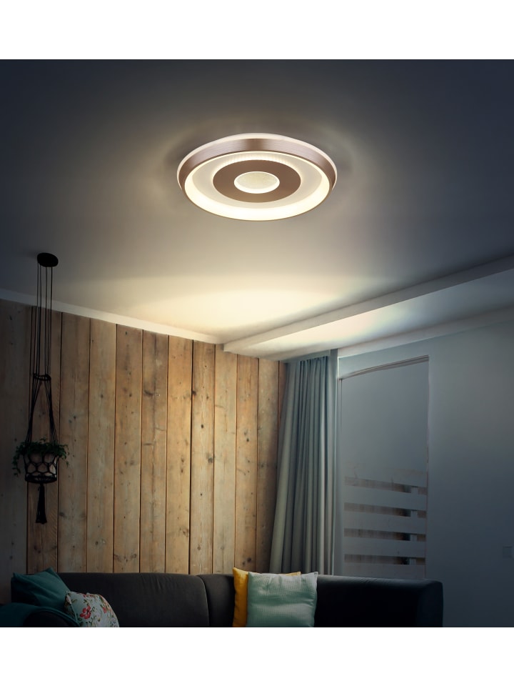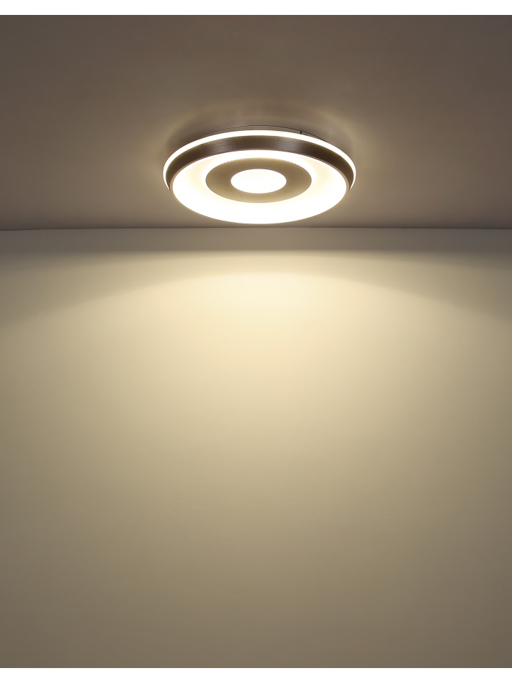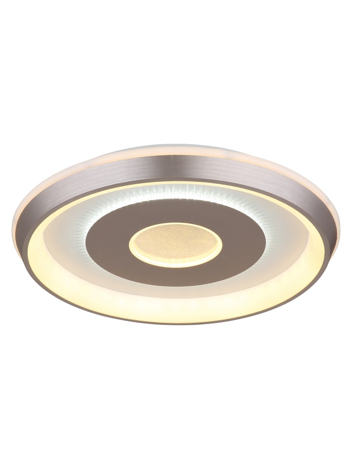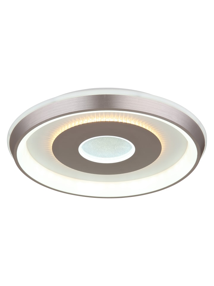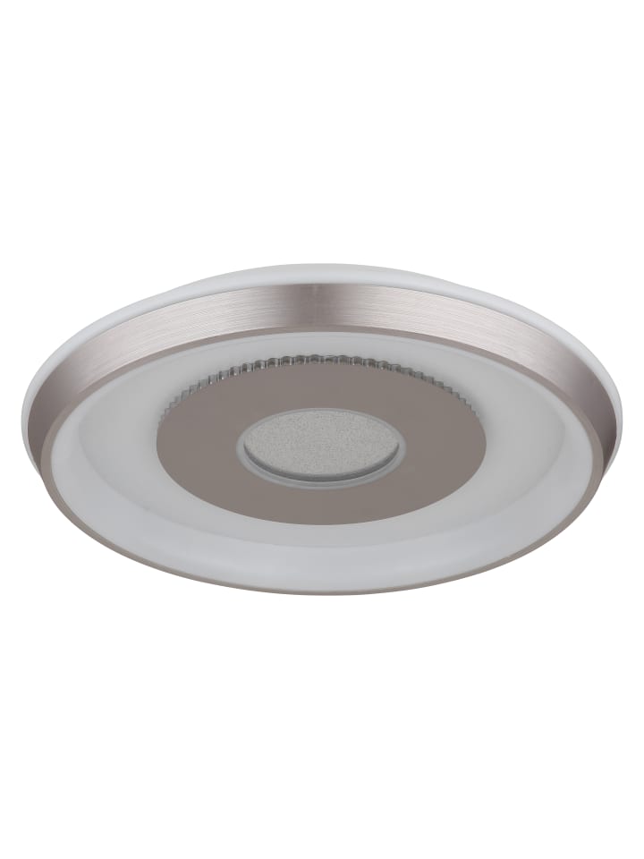 Потолочный светильник, металл, белый матовый; пластик, матовый шампанского цвета; пластик, опаловый; пластик, зеркальный; несколько уровней яркости с помощью настенного переключателя; возможность фиксации цветов; функция памяти; центральное зеркало с кристаллическим песком; ø: 490 мм, H: 70 мм; в комплекте светодиод 40 Вт 230 В, источник света 4700 лм, световой поток 1700 лм, цветовая температура 2700/4000/6500 K