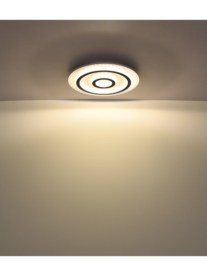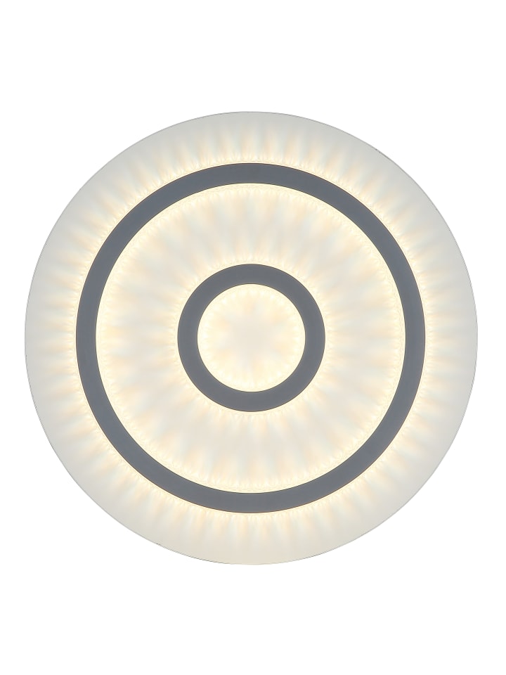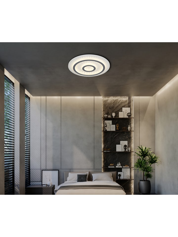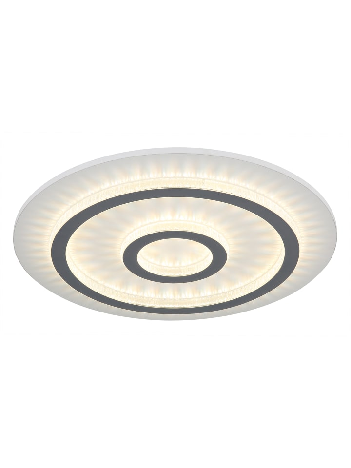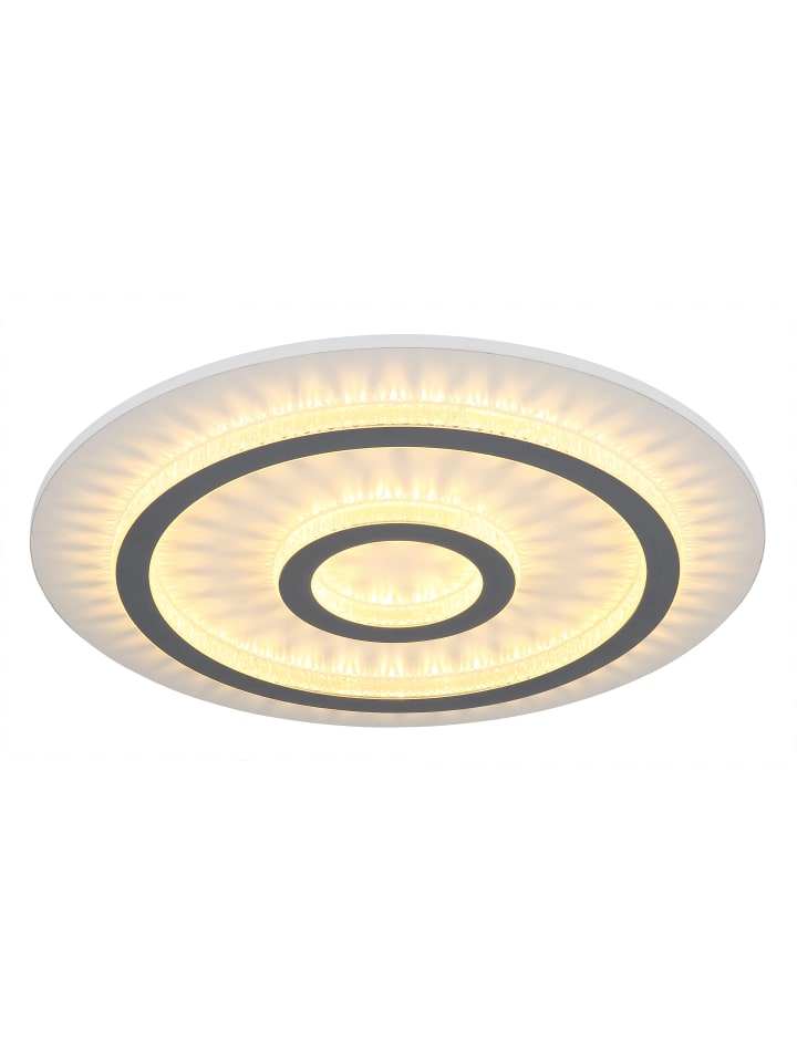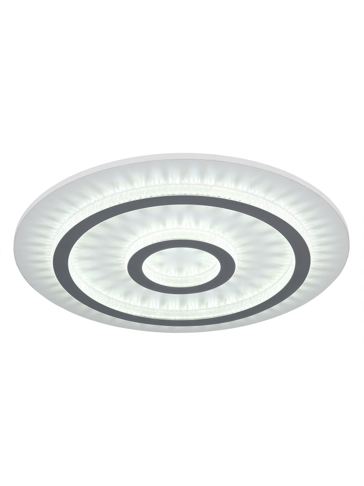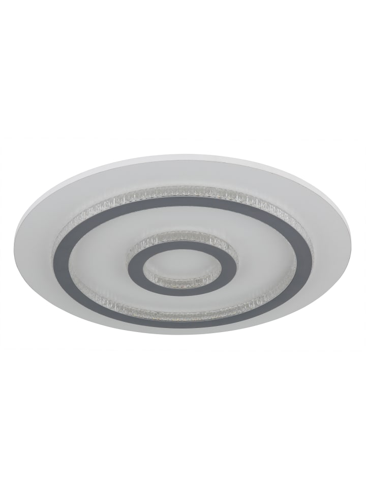 Потолочный светильник, металл, белый матовый; пластик, белый матовый; прозрачные пластиковые кристаллы; светло-серый матовый пластик; регулировка яркости, несколько уровней с помощью настенного переключателя; возможность фиксации цветов; функция памяти; ночник; таймер; пульт дистанционного управления; батарейки в комплекте (2 x AAA); диаметр: 450 мм; высота: 55 мм; в комплект входит светодиод мощностью 40 Вт 230 В, источник света 400-4700 лм, световой поток 130-1300 лм, цветовая температура 3000-6500 К