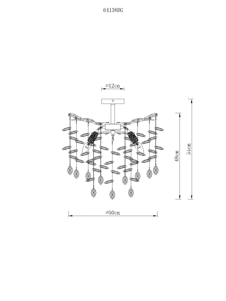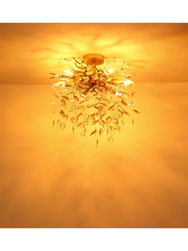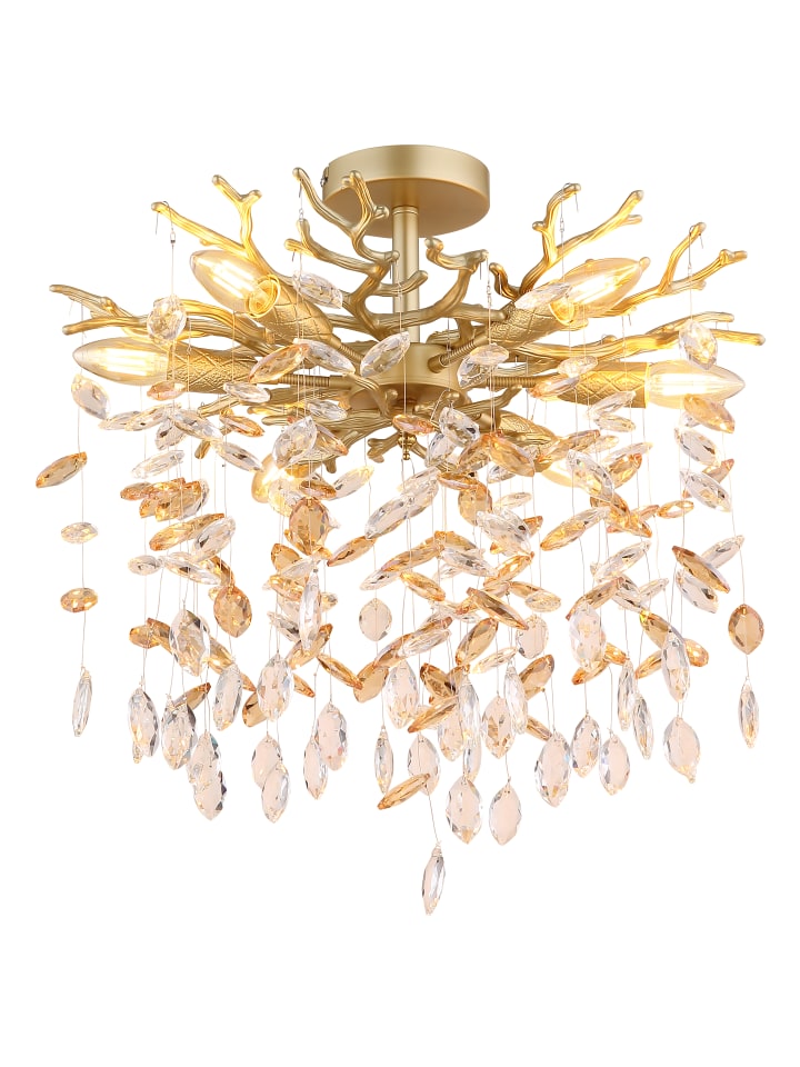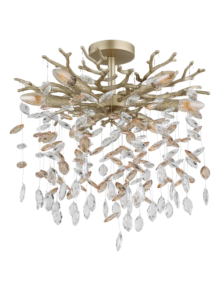 Потолочный светильник, металл, матовое золото, янтарные и прозрачные стеклянные кристаллы, гибкие патроны, ø: 500 мм, H: 560 мм, без 6 ламп E14 40 Вт 230 В