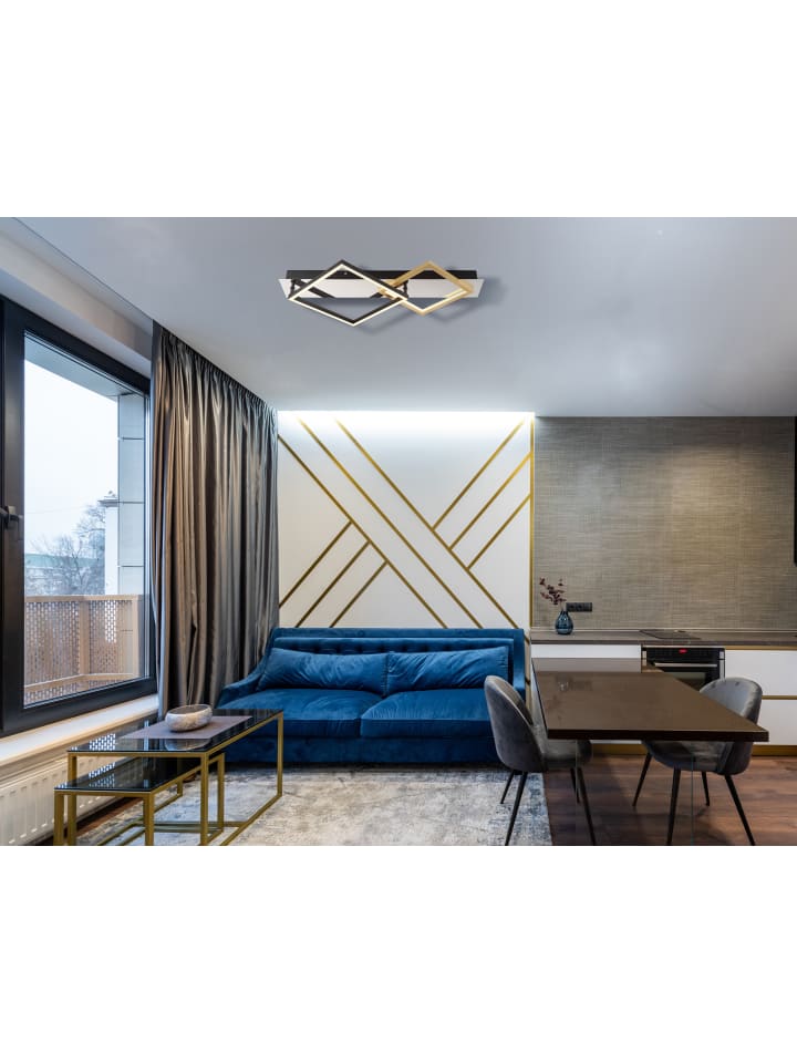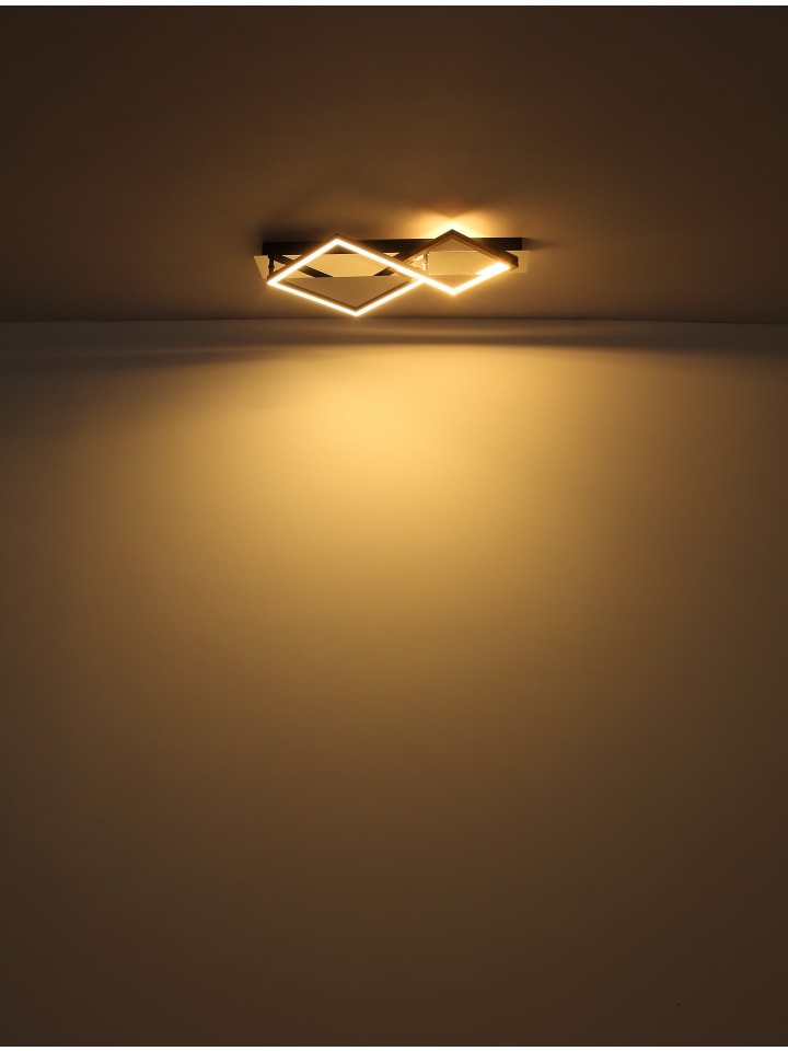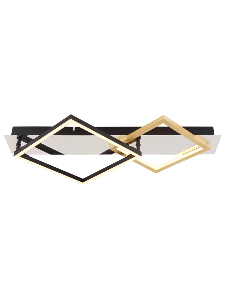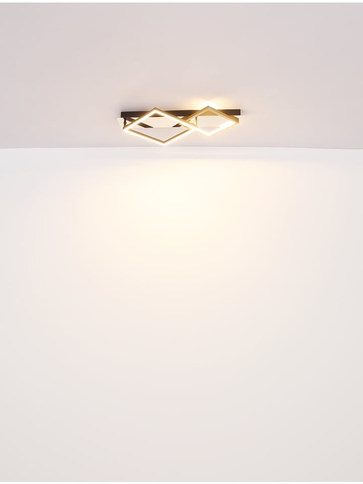 Потолочный светильник, хромированный металл, матовый черный металл, шлифованный алюминий цвета золота, опаловый пластик, ДxШxВ: 590x355x70 мм, в комплекте светодиод 24 Вт 230 В, источник света 2700 лм, световой поток 1100 лм, цветовая температура 3000 К