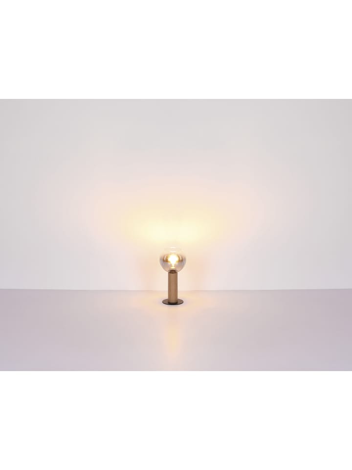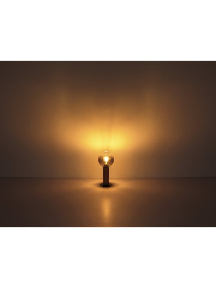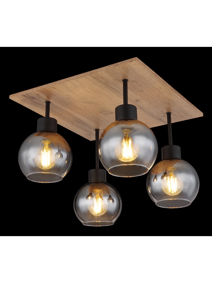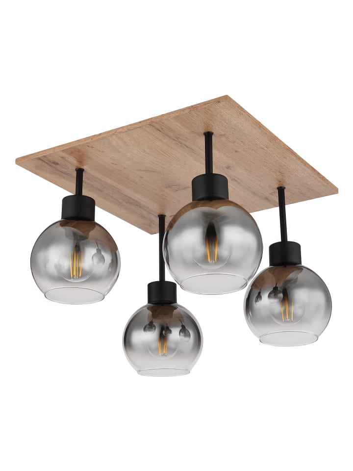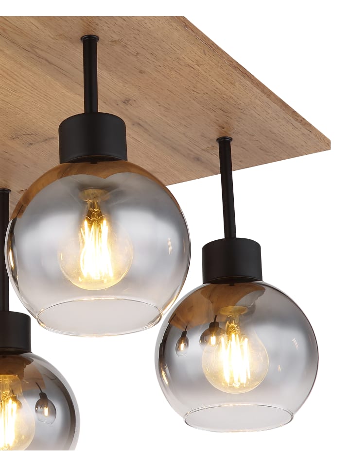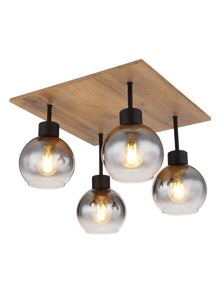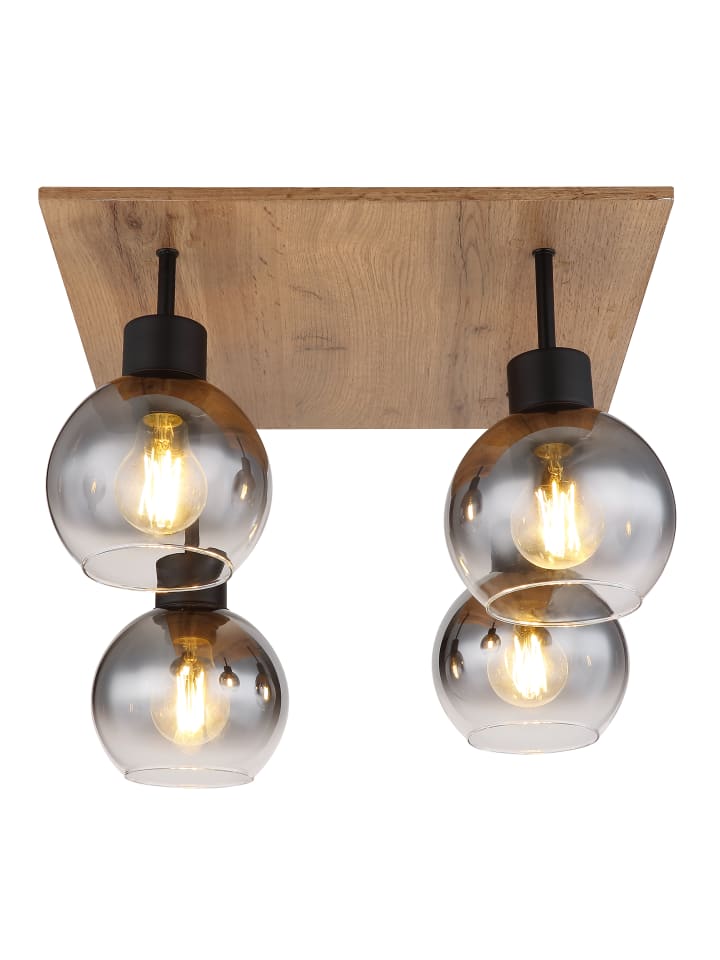 Потолочный светильник, матовый черный металл, МДФ с имитацией темного дерева, дымчатое прозрачное стекло, стеклянные плафоны, подвешенные на разной высоте, ДxШxВ: 400x400x335 мм, без 4 ламп E27 40 Вт 230 В
