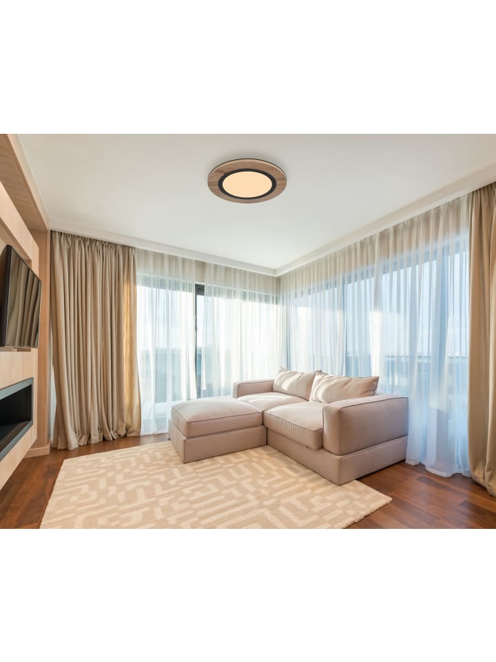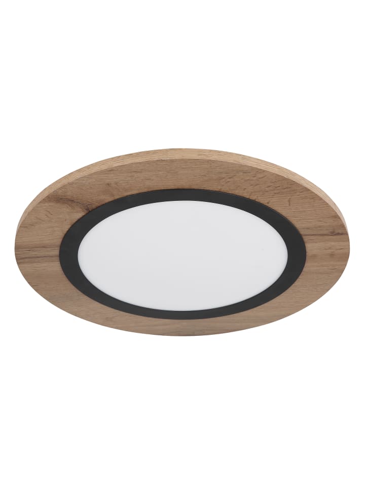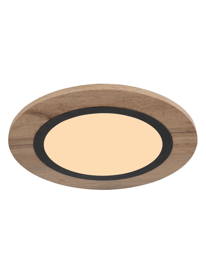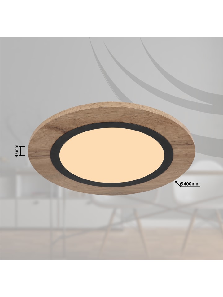 Потолочный светильник, металл матово-черный, МДФ под дерево темного цвета, опаловый пластик, диаметр: 400 мм, высота: 45 мм, в комплекте светодиод 15 Вт, 230 В, источник света 1700 лм, световой поток 800 лм, цветовая температура 3000 К