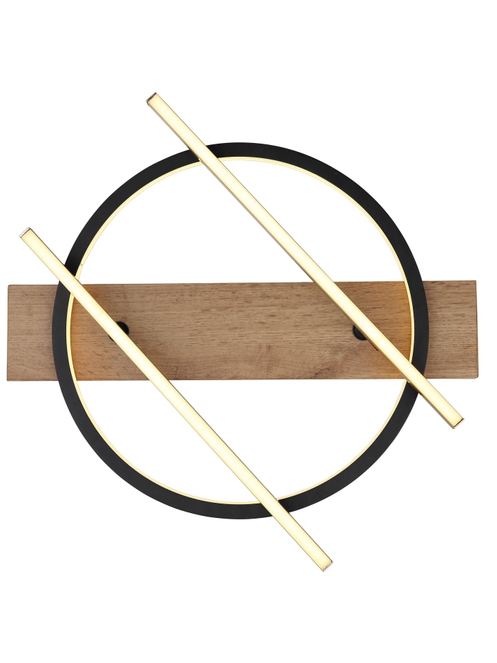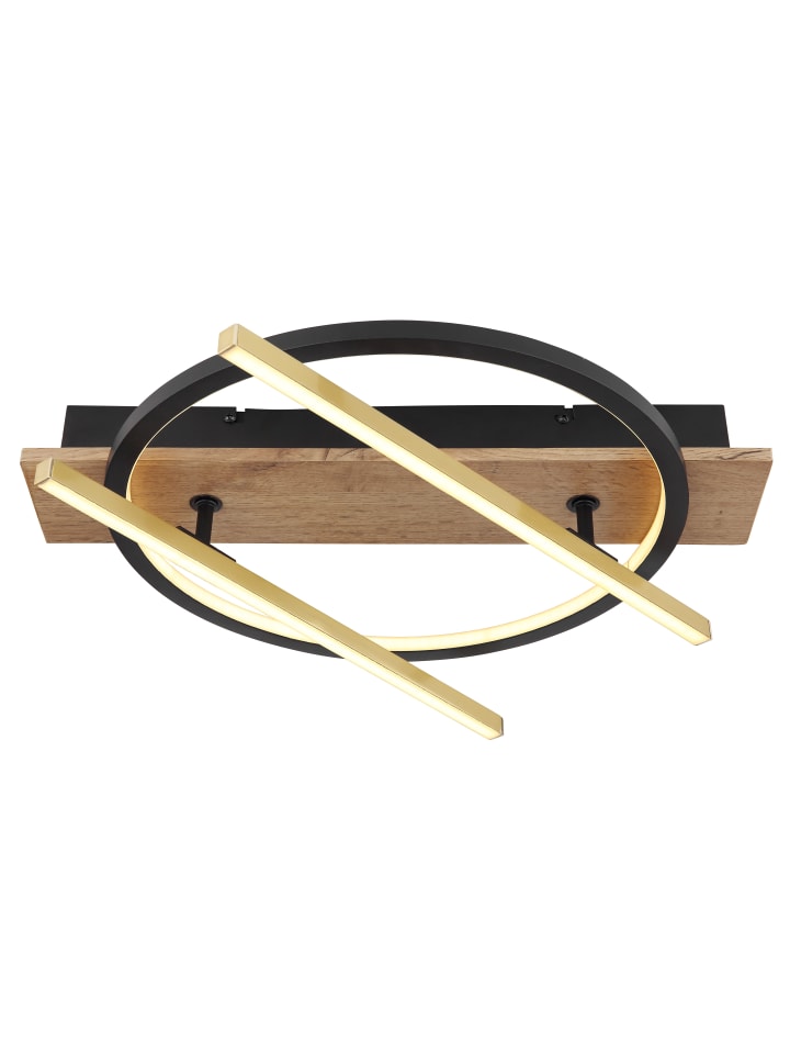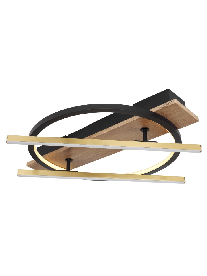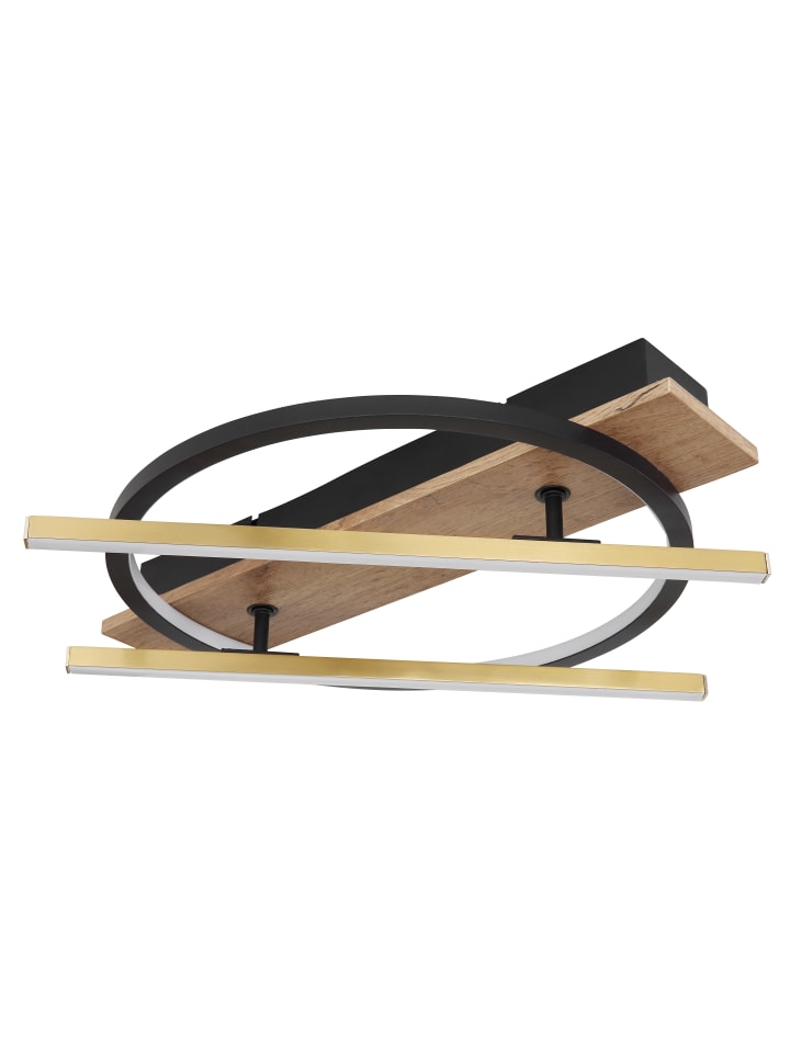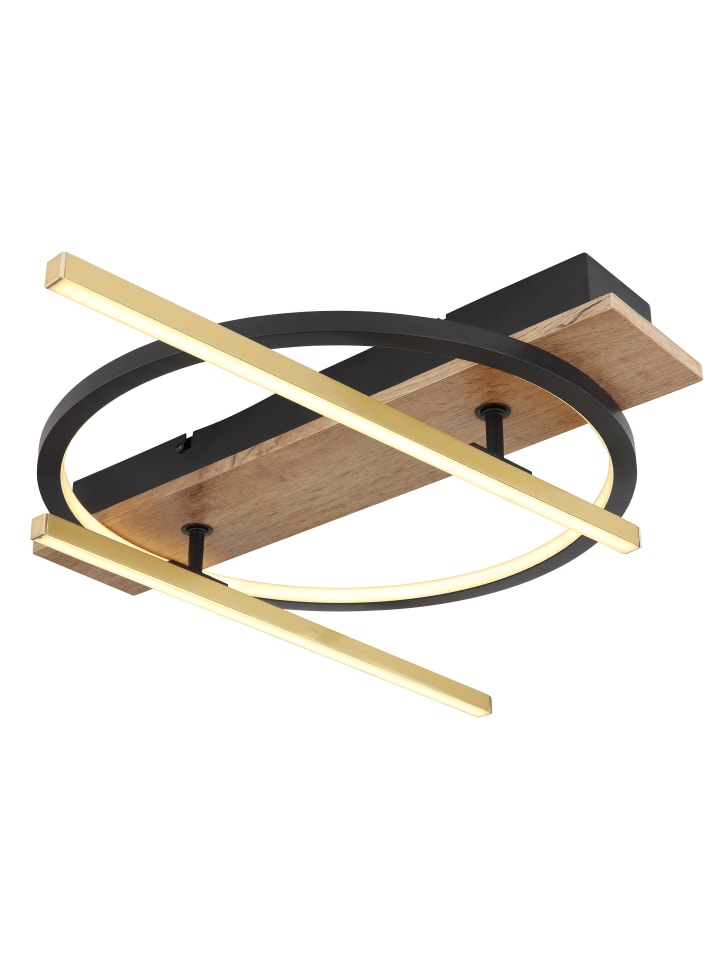 Потолочный светильник, матовый черный металл, МДФ с имитацией темного дерева, алюминиевые стержни цвета латуни, матовый черный алюминий, опаловый пластик, несколько настроек с помощью настенного переключателя, функция памяти, поворотный/вращающийся, 3 настройки: 1 только стержень, 2 внутри рамки, 3 вместе, ДxШxВ: 440x400x90 мм, длина стержня: 40 см, в комплекте светодиод 32 Вт 230 В, источник света 3300 лм, световой поток 1300 лм, цветовая температура 3000 К
