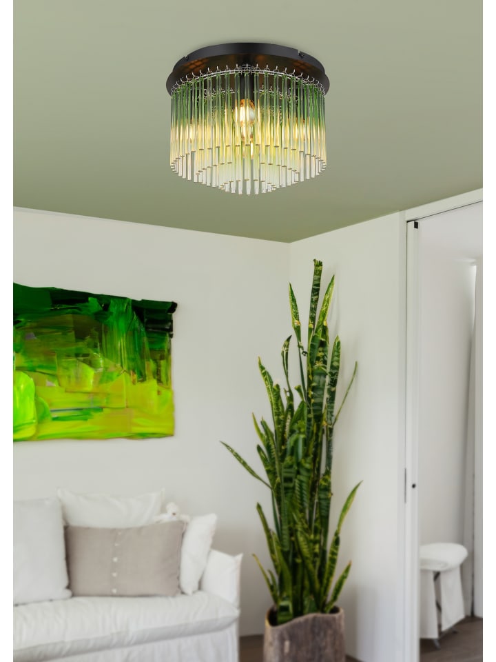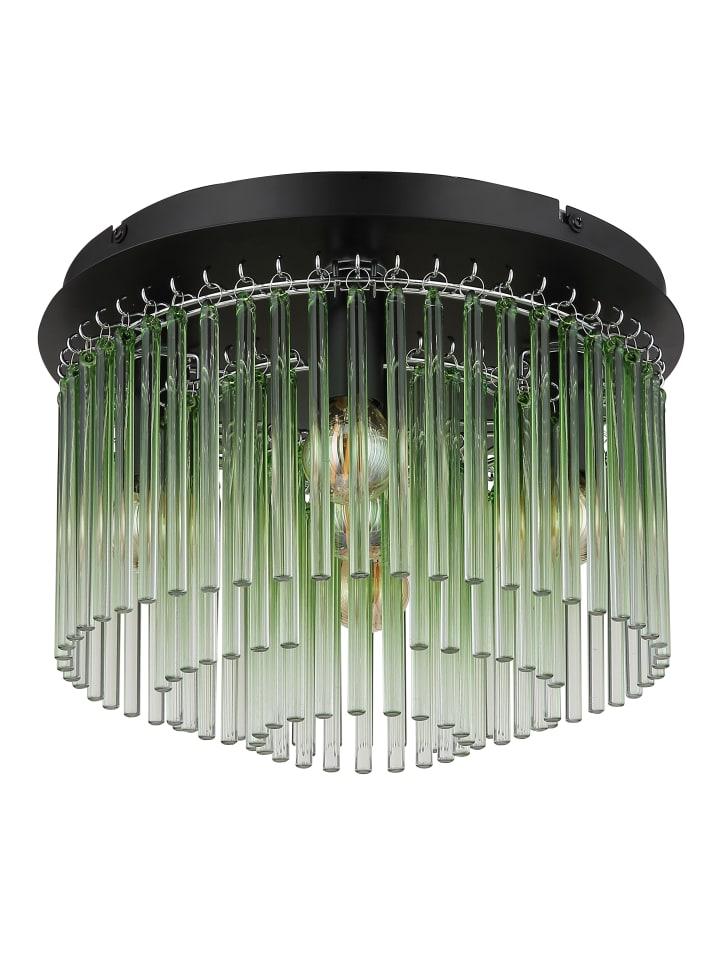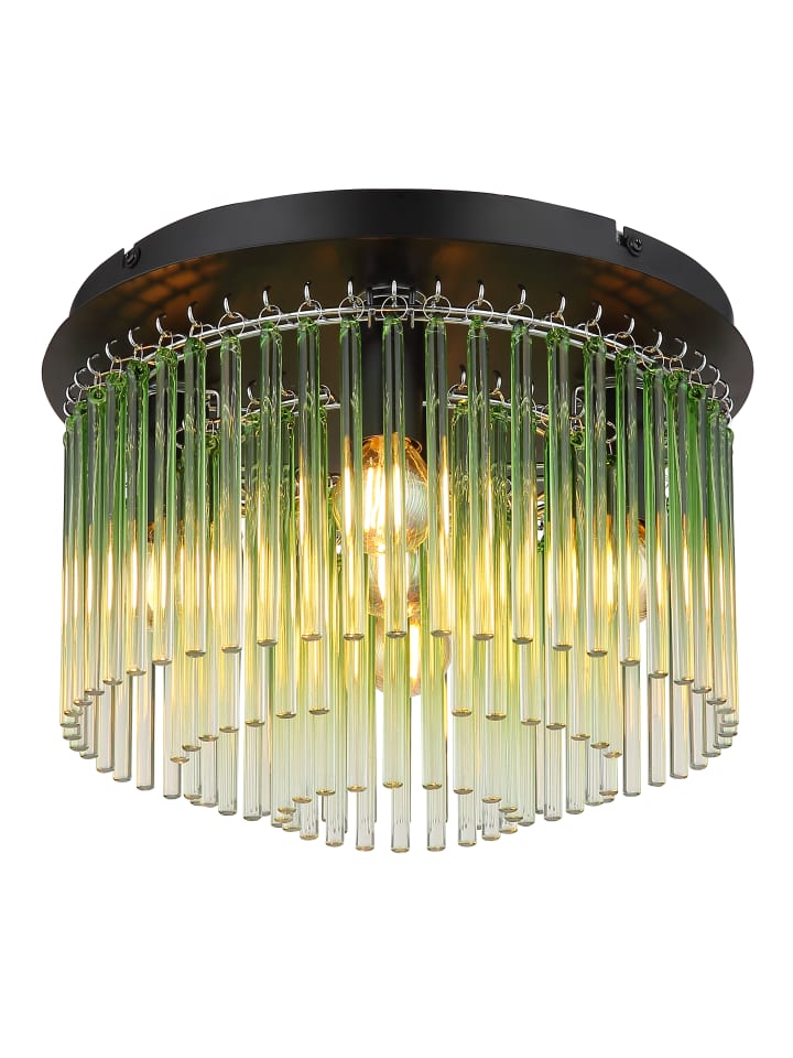 Потолочный светильник, матовый черный металл, хромированный металл, зеленый, прозрачные стеклянные стержни с градиентом, ø: 320 мм, H: 230 мм, без 5 ламп E14 40 Вт 230 В