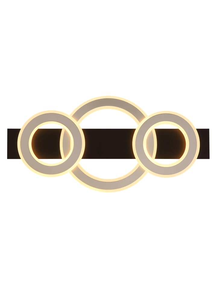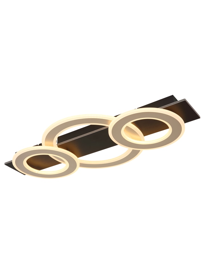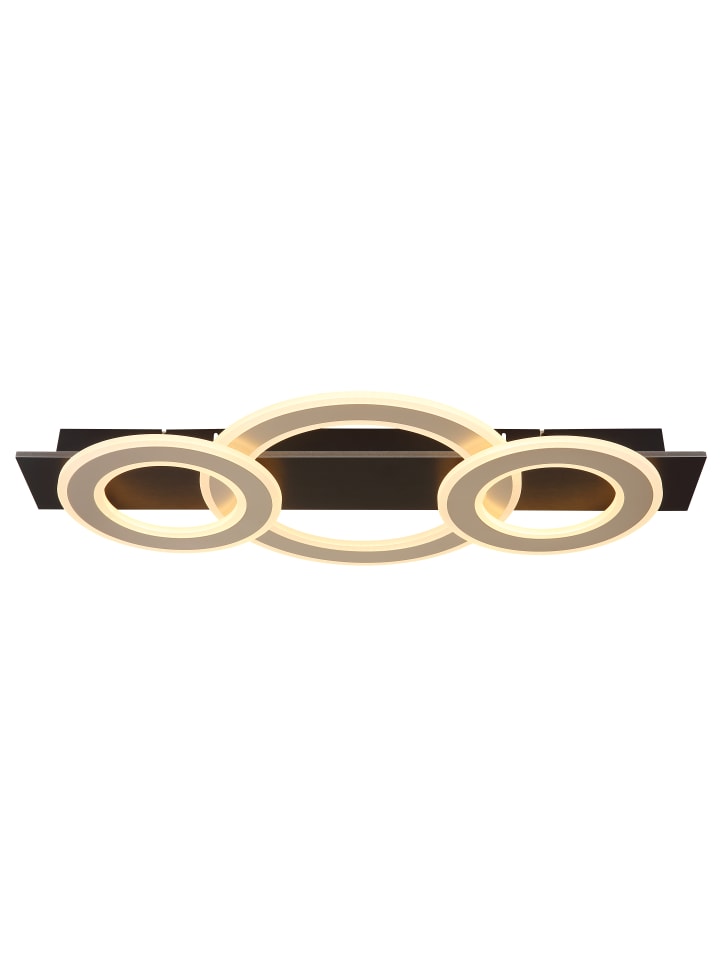 Потолочный светильник, матовый черный металл, матовый темно-коричневый МДФ, матовый металл цвета шампанского, опаловый акрил, Д x Ш x В: 730 x 350 x 70 мм, диаметр кольца: 1 x 35 см, 2 x 24 см, в комплекте светодиод 50 Вт 230 В, источник света 4700 лм, световой поток 2300 лм, цветовая температура 3000 К